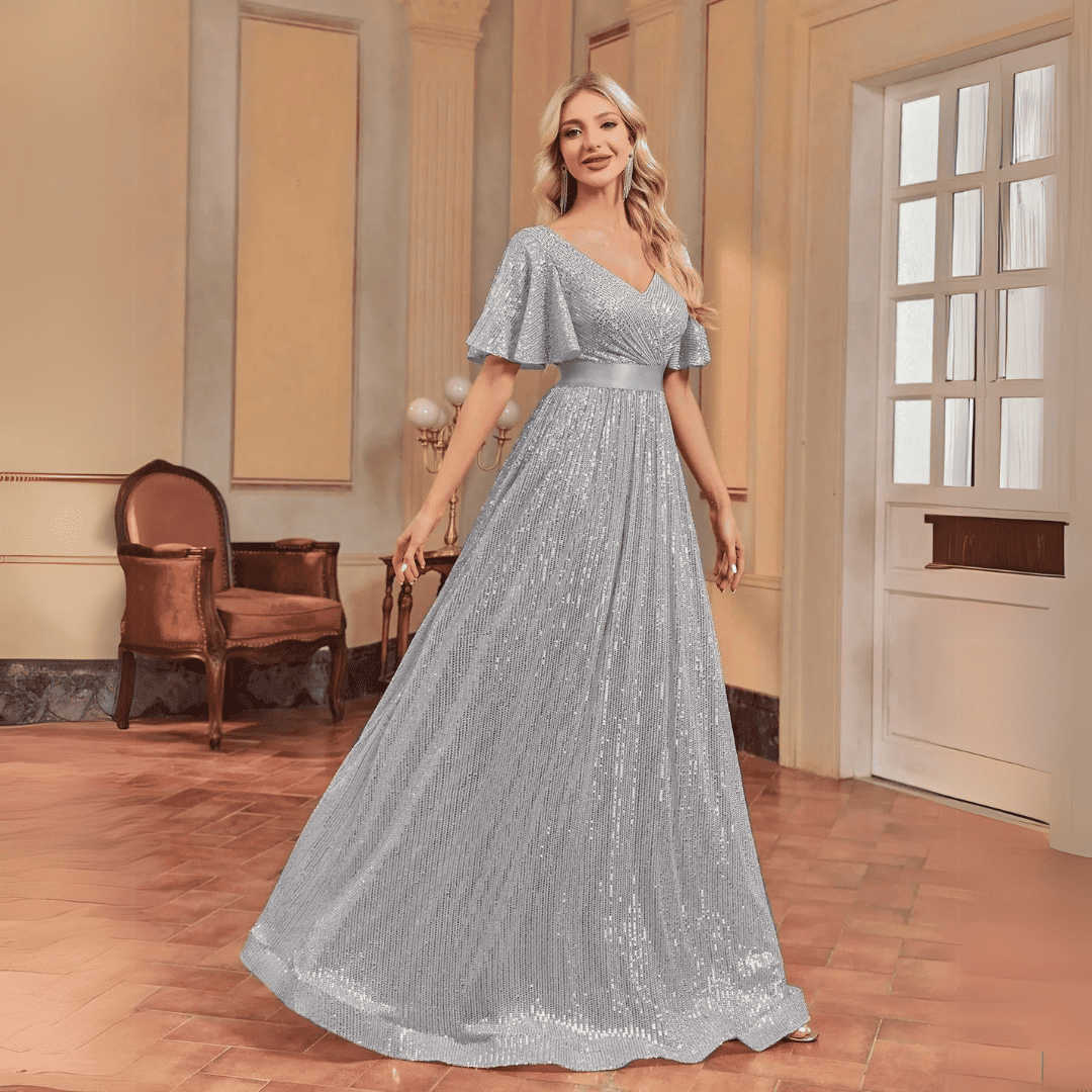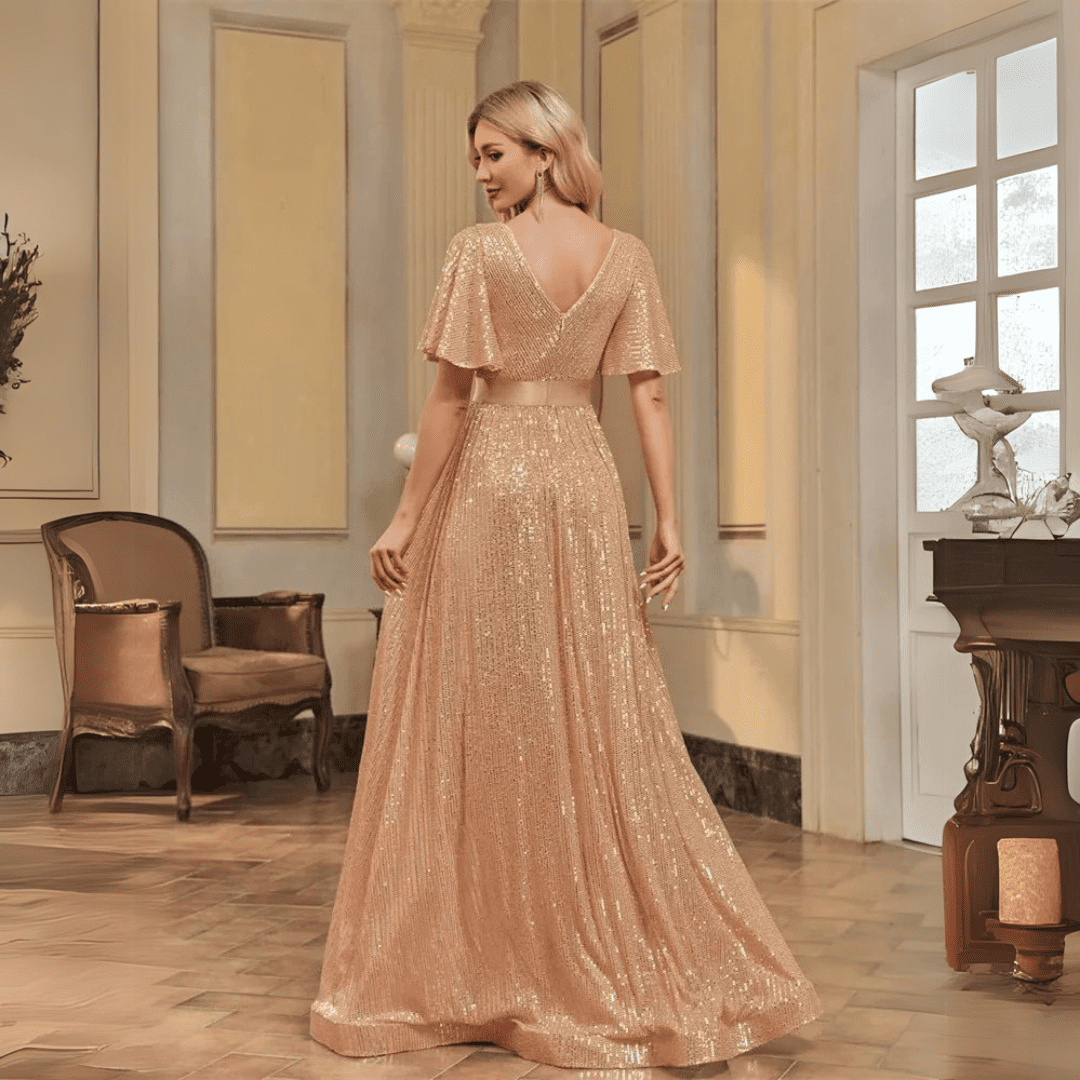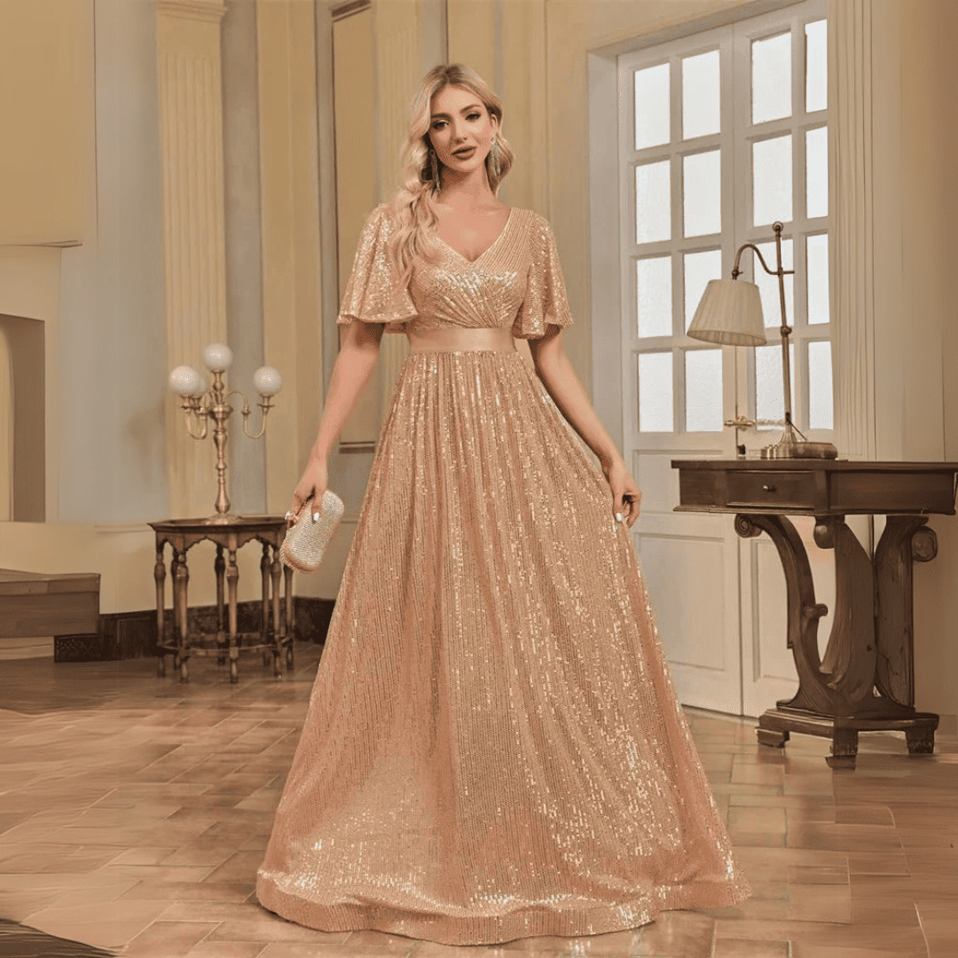 Zostań gwiazdą wieczoru dzięki tej olśniewającej sukni z cekinami, idealnej dla druhen lub na eleganckie przyjęcia. Klasyczny krój w kształcie litery A z paskiem podkreśla talię, a dekolt w kształcie litery V i krótkie rękawy dodają elegancji. W złotym kolorze z łatwością przyciągniesz uwagę i rozświetlisz każde wydarzenie.