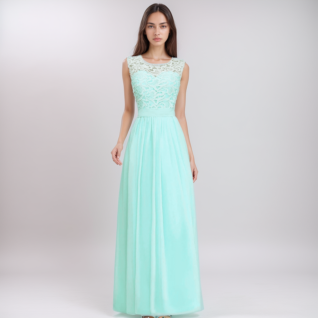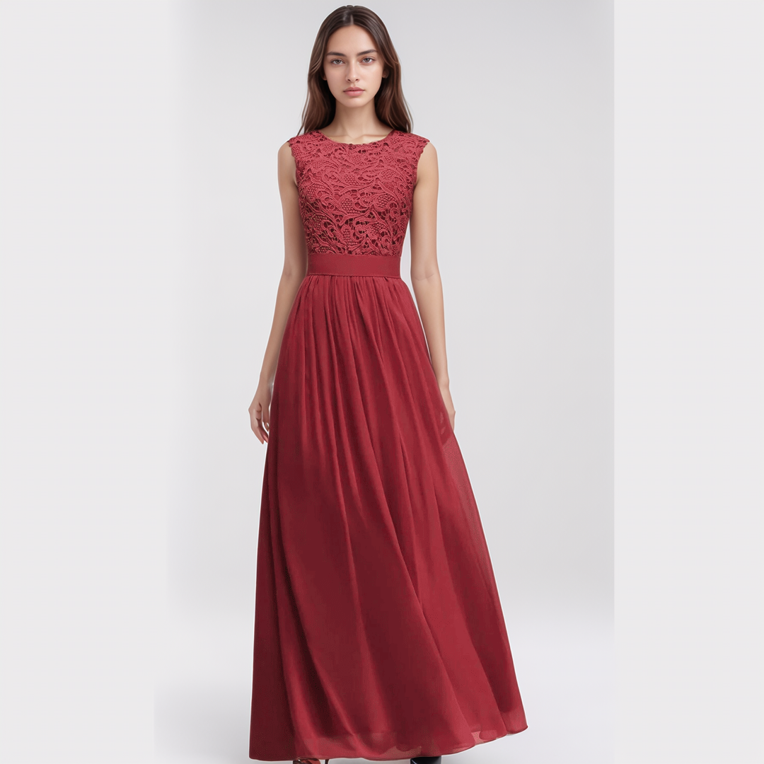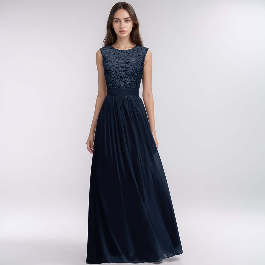 Długa szyfonowa suknia dla druhen z koronkowymi detalami