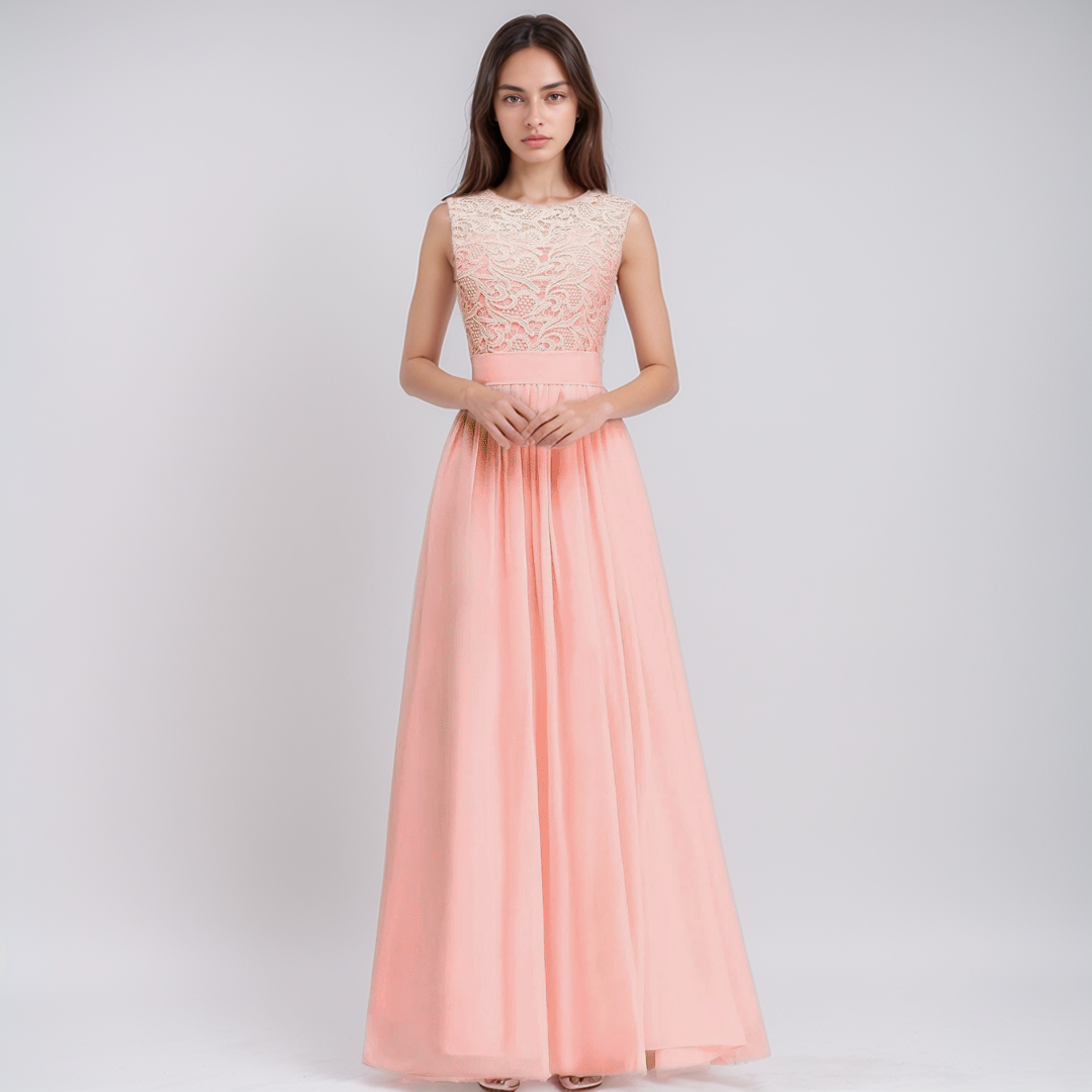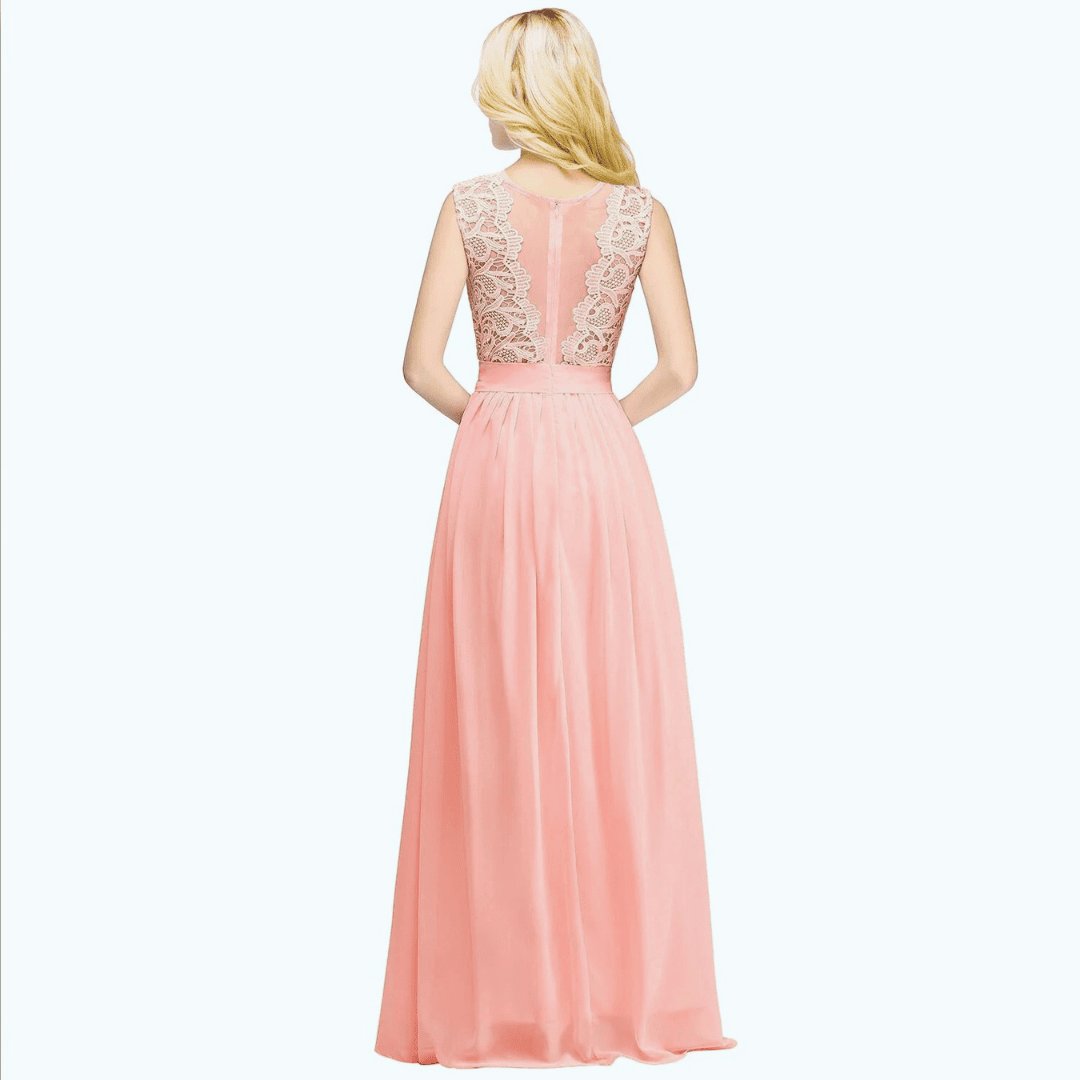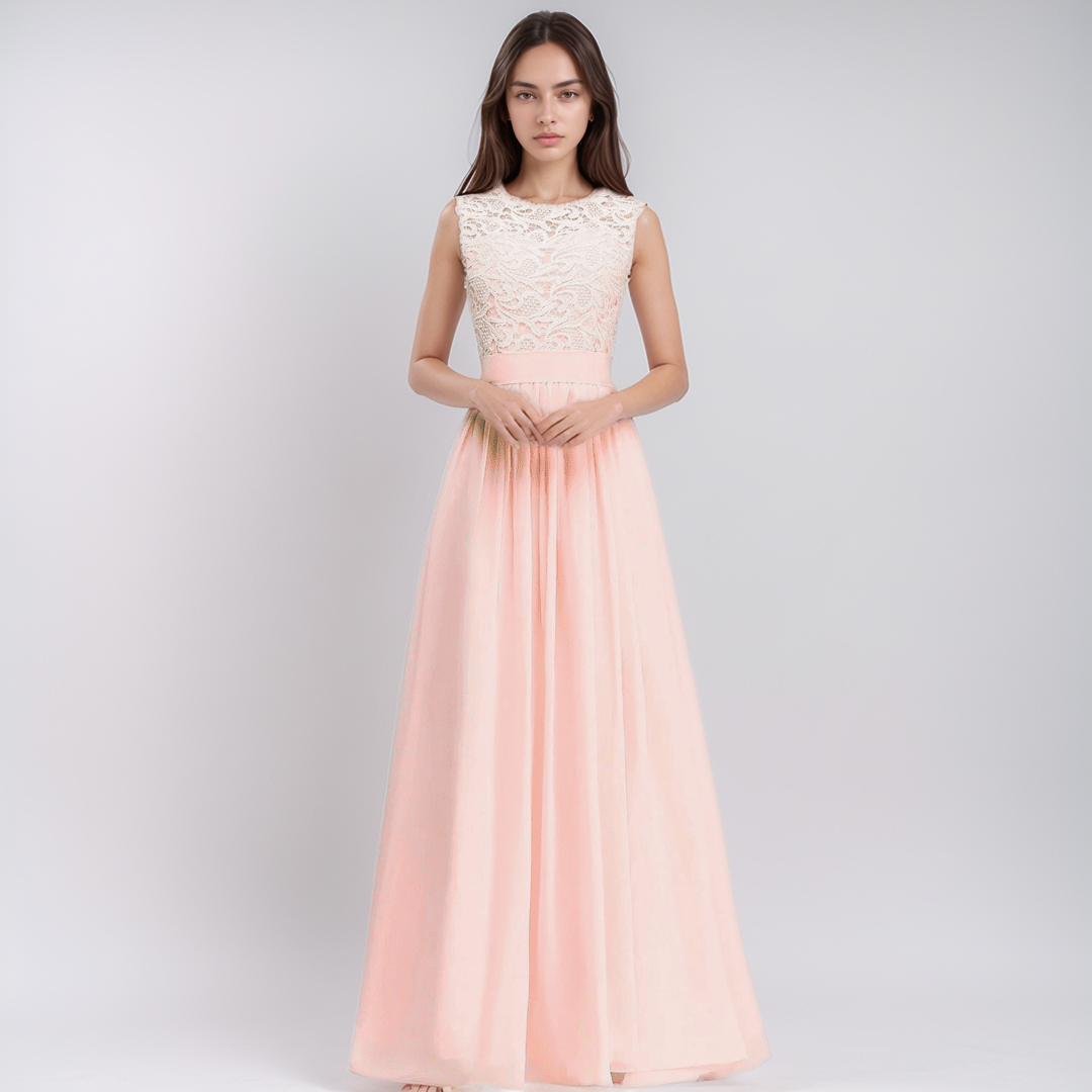 Dodaj wyjątkowej elegancji każdej weselnej uroczystości dzięki szyfonowej sukni druhny z koronkowym dekoltem O i zwiewnym fasonem. Jej subtelne wykończenie oraz różowy kolor podkreślają delikatność i styl, a wbudowany biustonosz zapewnia wygodę podczas długich ceremonii.