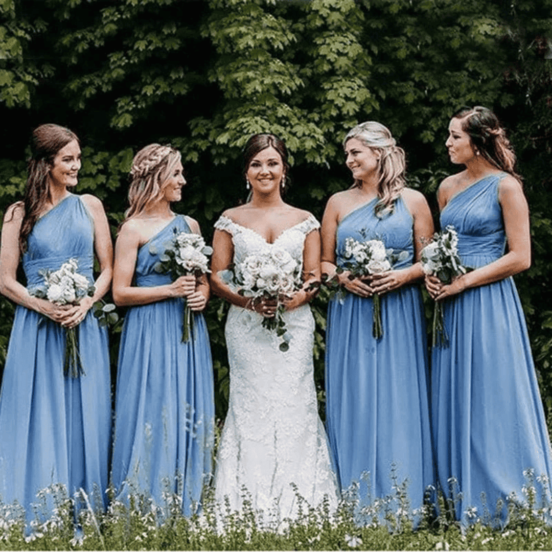 Elegancka sukienka z asymetrycznym ramiączkiem w modnym kolorze nieba. Delikatna sylwetka w stylu empire i plisowany krój nadają jej wyjątkowego uroku, a lekki szyfon swobodnie opływa sylwetkę. Wbudowany biustonosz zapewnia wygodę i perfekcyjne dopasowanie. Dostępne rozmiary plus size, by każda kobieta czuła się piękna.