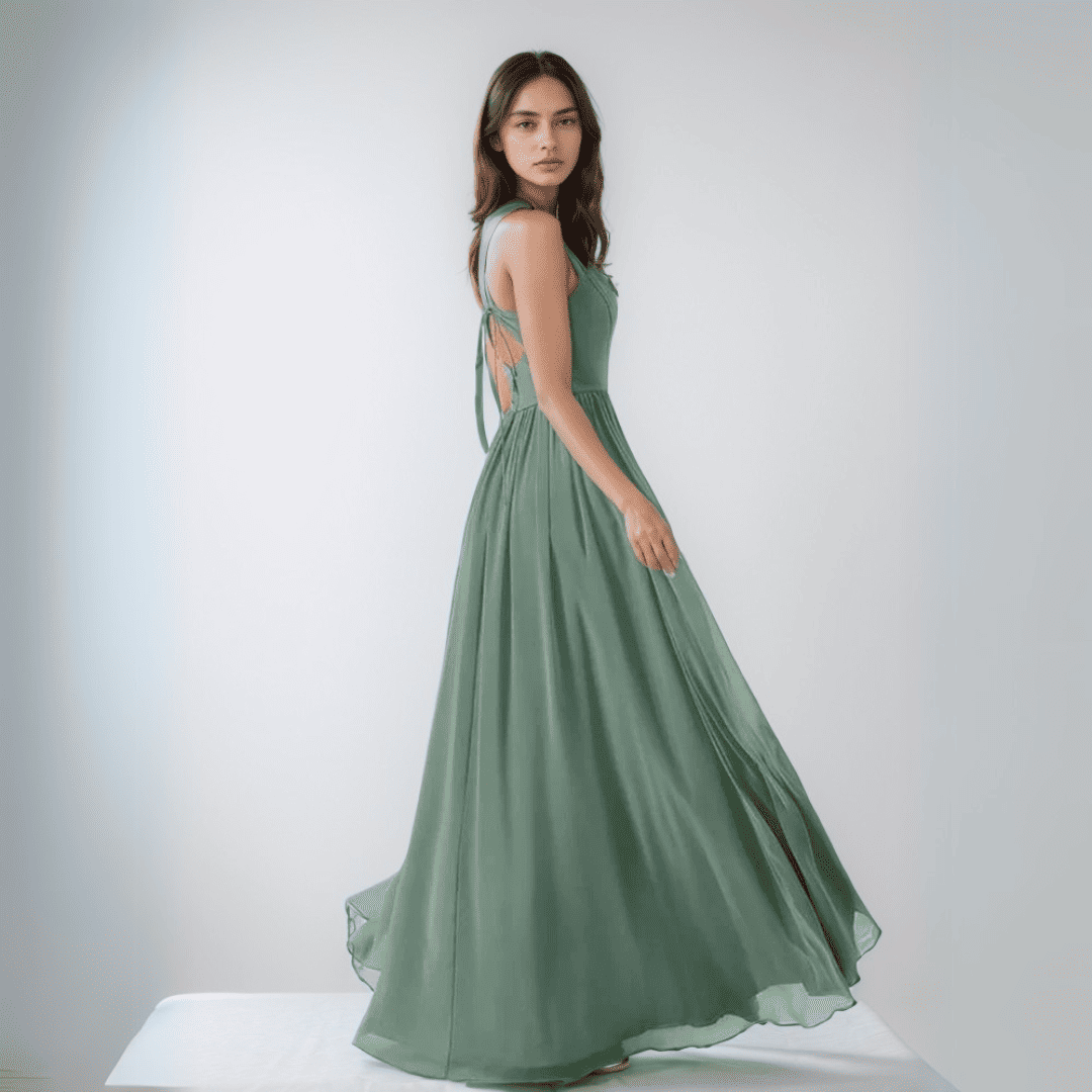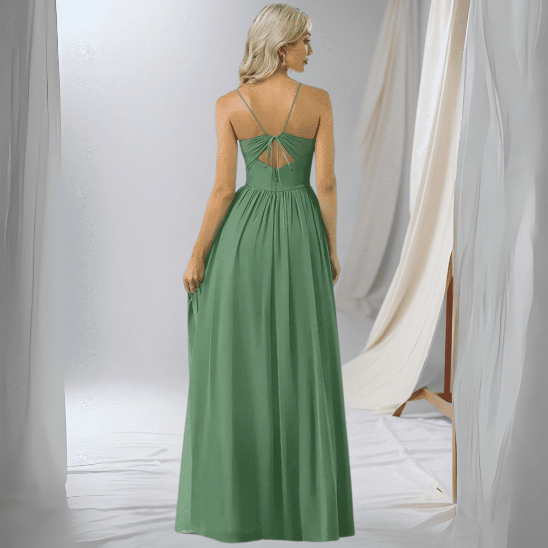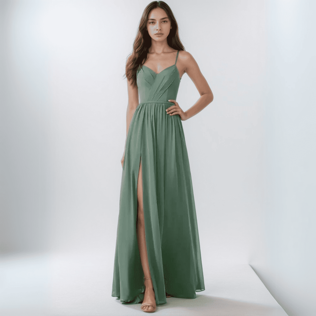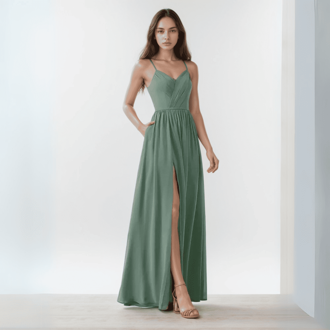 Wyróżnij się podczas każdej uroczystości w tej zwiewnej sukience dla druhen. Wykonana z lekkiego szyfonu, z subtelnym dekoltem w kształcie litery V i delikatnymi ramiączkami, tworzy eteryczny i romantyczny wygląd. Koronkowe wiązanie z tyłu i boczne rozcięcie dodają szyku i wygody.