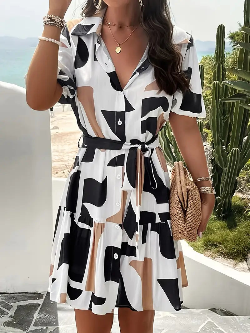 Modna sukienka zapinana na guziki z geometrycznym nadrukiem, przewiewna i modna na każdą okazję