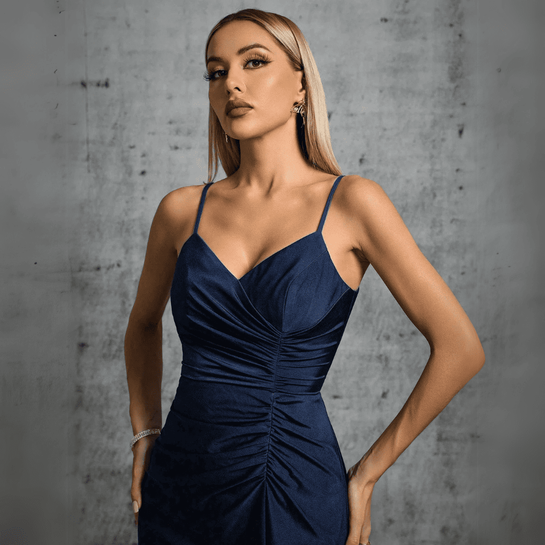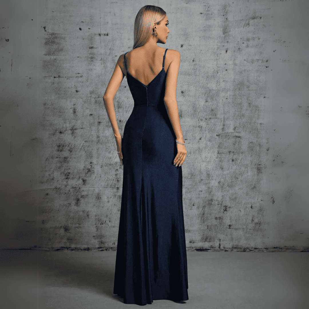 Stworzona, aby Twoje druhny wyglądały elegancko i stylowo, granatowa sukienka Nadine z ramiączkami spaghetti to idealny wybór. Wykonana z luksusowego weluru, długa sukienka o kroju A-line zachwyca klasyczną linią i głębokim granatowym kolorem. Dekolt w kształcie litery V oraz subtelne ramiączka dodają uroku, a rozporek boczny podkreśla nowoczesny charakter plisowanego materiału.