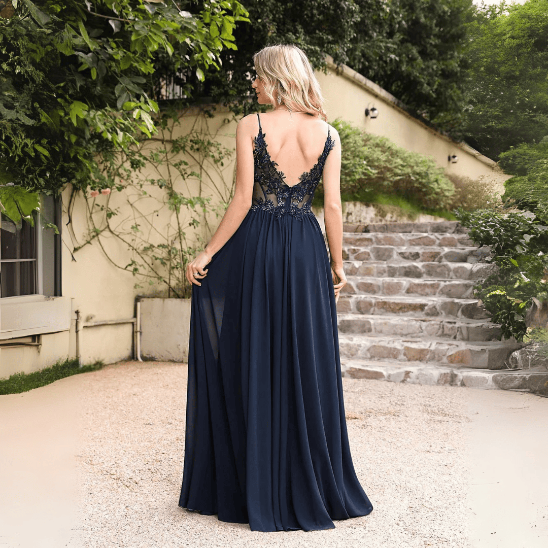 Zachwyć gości na wyjątkowej uroczystości w tej granatowej sukni z szyfonu, ozdobionej kwiatowymi aplikacjami. Model o kroju A-line z dekoltem w kształcie litery V i cienkimi ramiączkami podkreśla kobiecą sylwetkę, a długość do ziemi nadaje szyku i klasy. Idealna jako suknia dla druhen lub na inne formalne okazje.