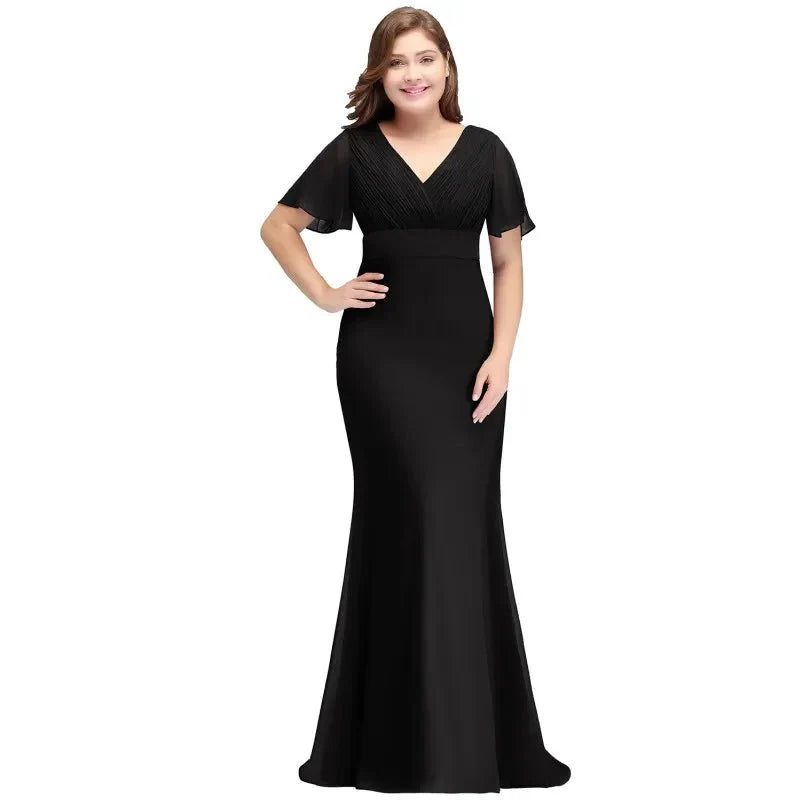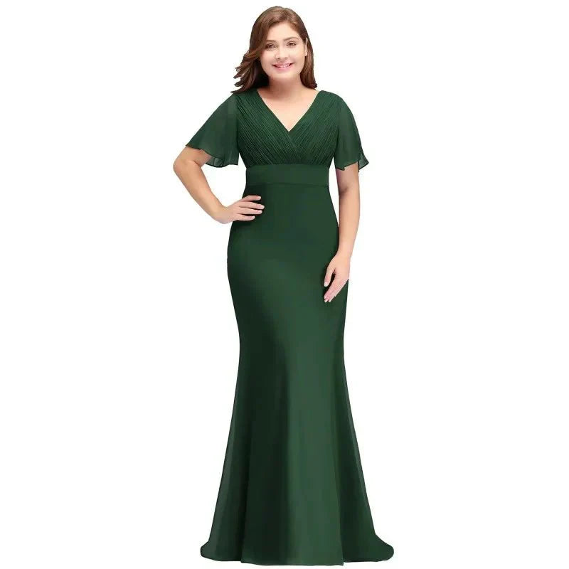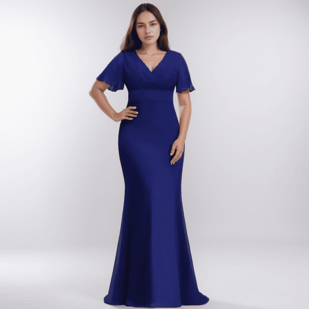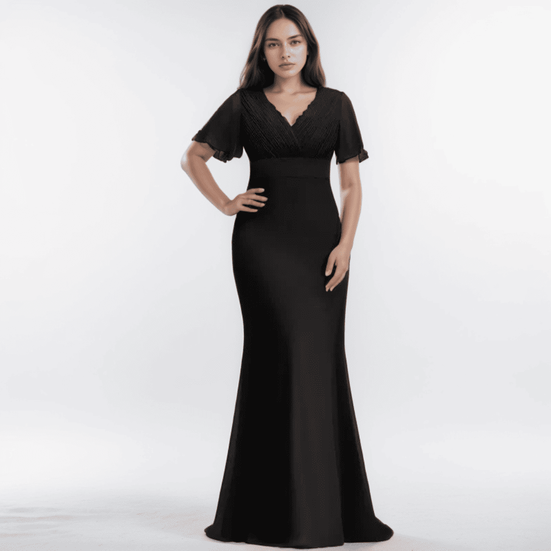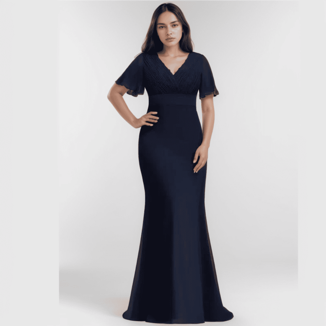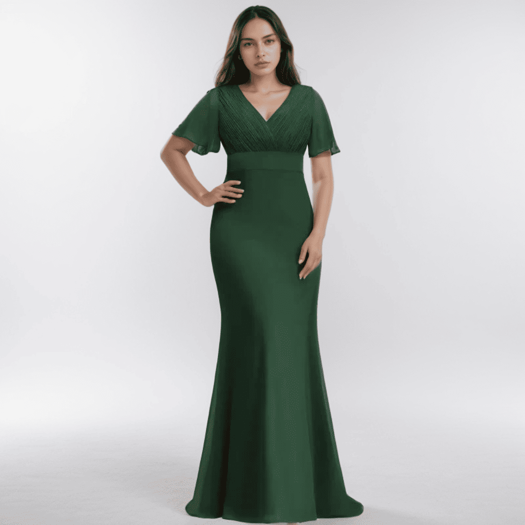 Dodaj klasy i elegancji każdej uroczystości dzięki tej zachwycającej sukience dla druhny. Szyfonowa kreacja o kroju syreny, z dekoltem w kształcie litery V i wbudowanym biustonoszem, zapewnia komfort i podkreśla sylwetkę. Krótkie rękawy i plisowany pas nadają jej wyjątkowego charakteru.