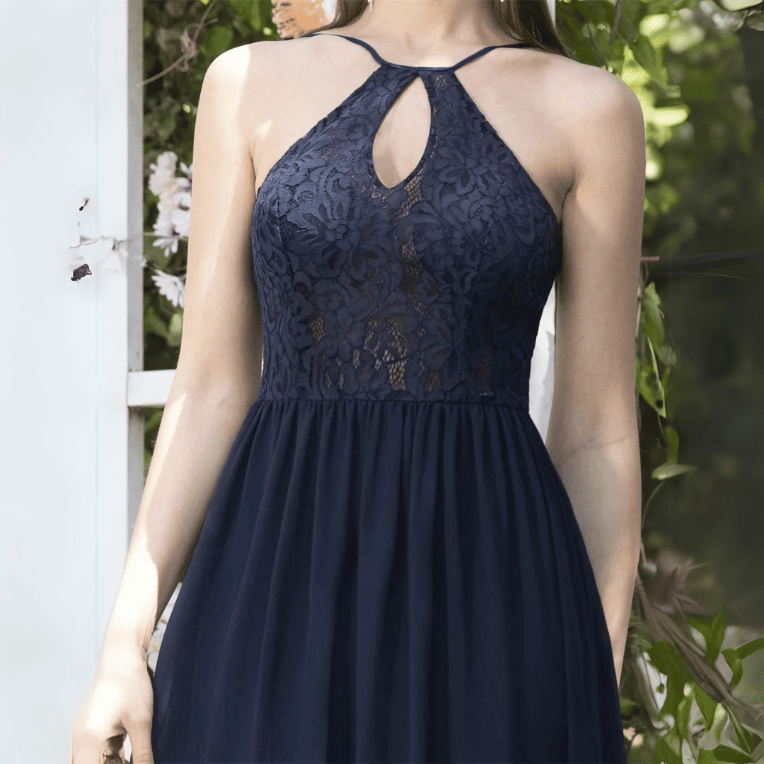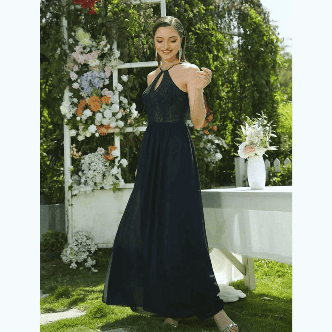 Dodaj odrobinę klasy do formalnych wydarzeń z naszą granatową sukienką na ramiączkach. Wykonana z wysokiej jakości szyfonu, o linii A, podkreśla sylwetkę i zapewnia wygodę dzięki wbudowanemu biustonoszowi. Długość do ziemi oraz elegancki dekolt halter to idealne połączenie stylu i komfortu.