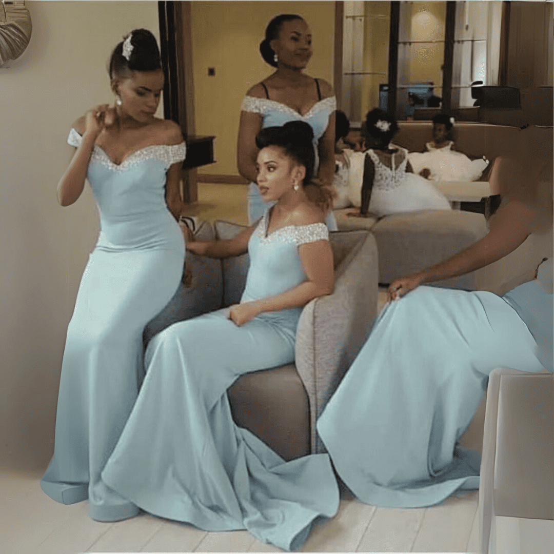 Oczaruj gości dzięki subtelnym sukniom w błękitnym odcieniu. Te delikatne sukienki z satyny z odkrytymi ramionami i wyjątkowym zdobieniem z koralików emanują elegancją i romantyzmem. Doskonale dopasowane do indywidualnych rozmiarów, gwarantują wyjątkowy wygląd każdej druhny.