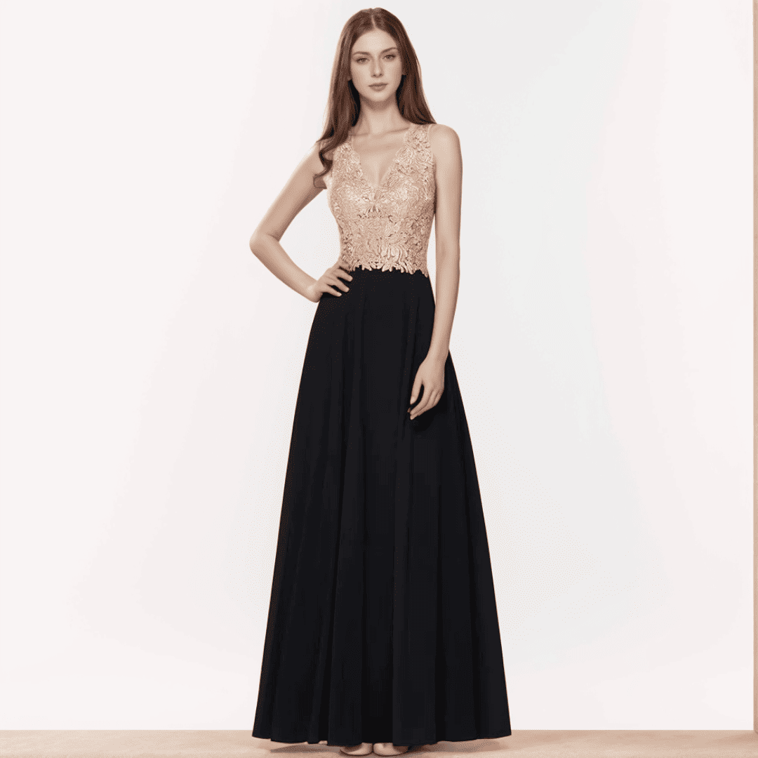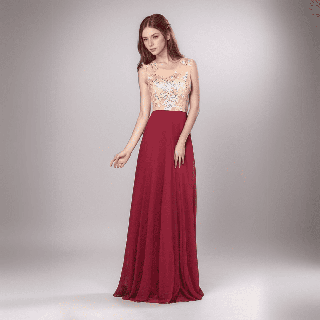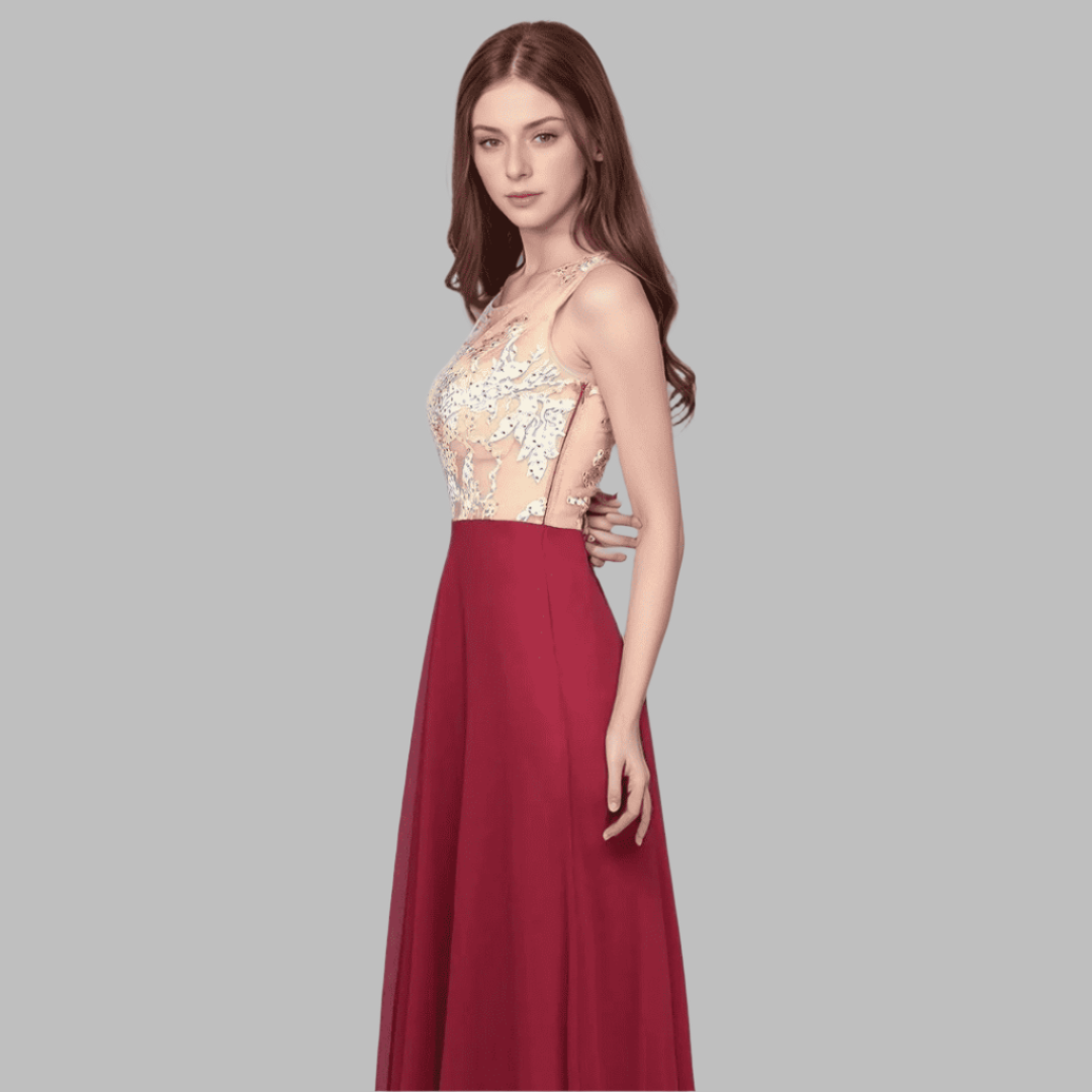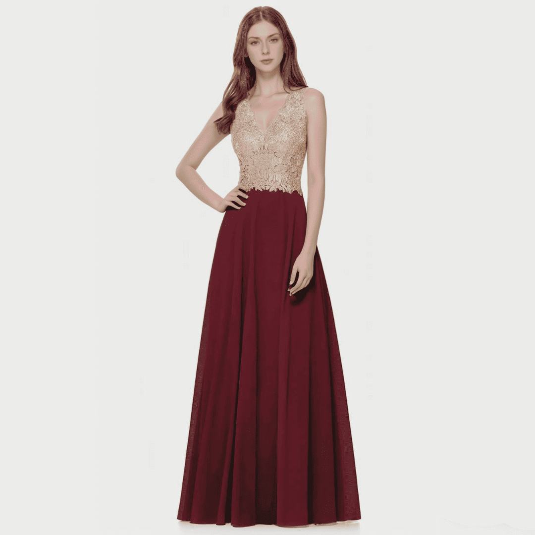 Zachwyć wszystkich w tej wyjątkowej, długiej sukni z odkrytymi plecami, idealnej dla druhny. Wykonana z delikatnego szyfonu w bordowym odcieniu, podkreśla figurę A-liniowym krojem, a koronkowe aplikacje dodają jej elegancji. Serdeczny dekolt i wbudowany biustonosz zapewniają romantyzm i komfort podczas każdej uroczystości.