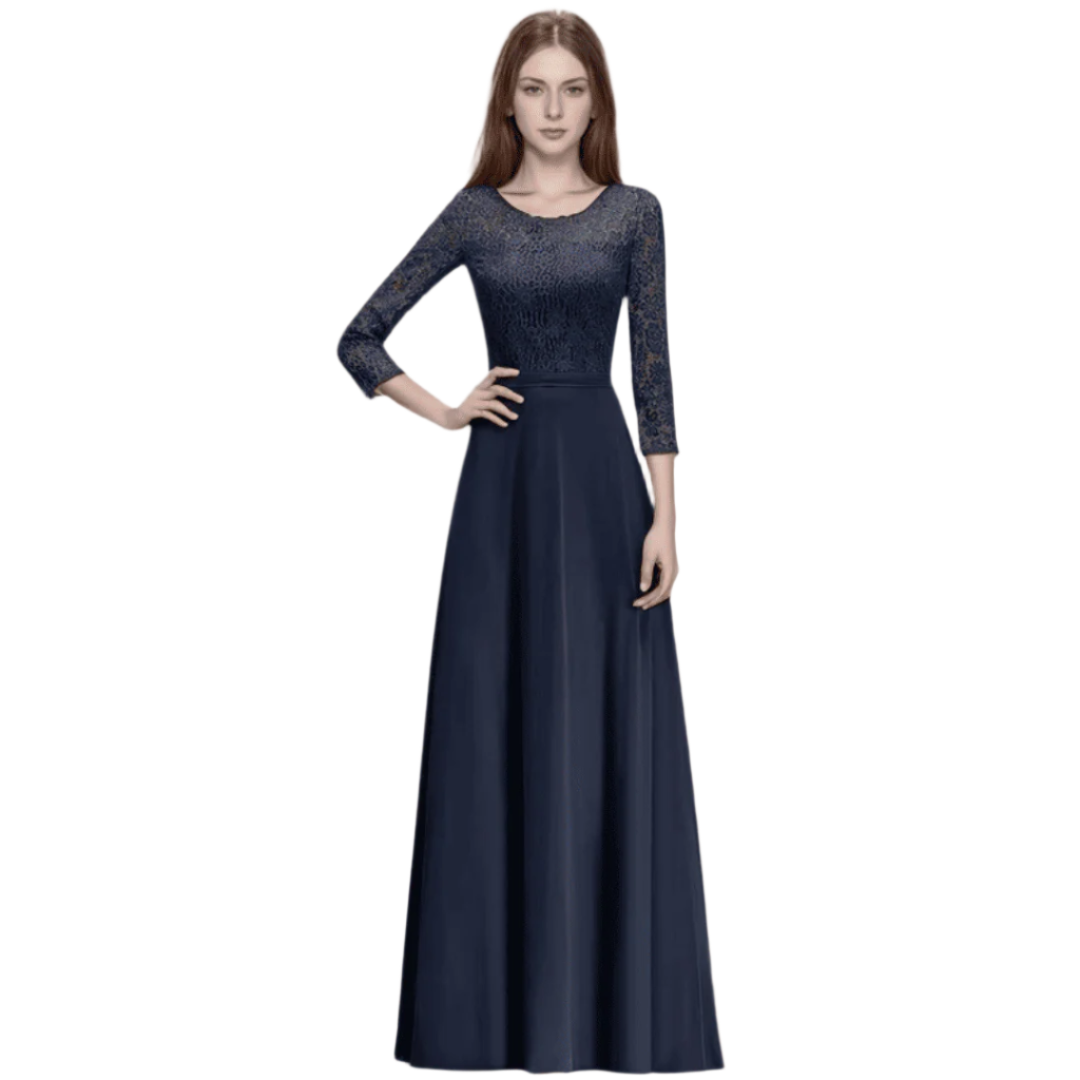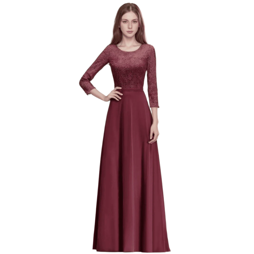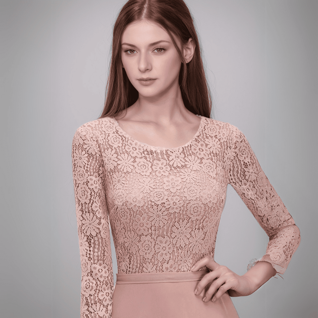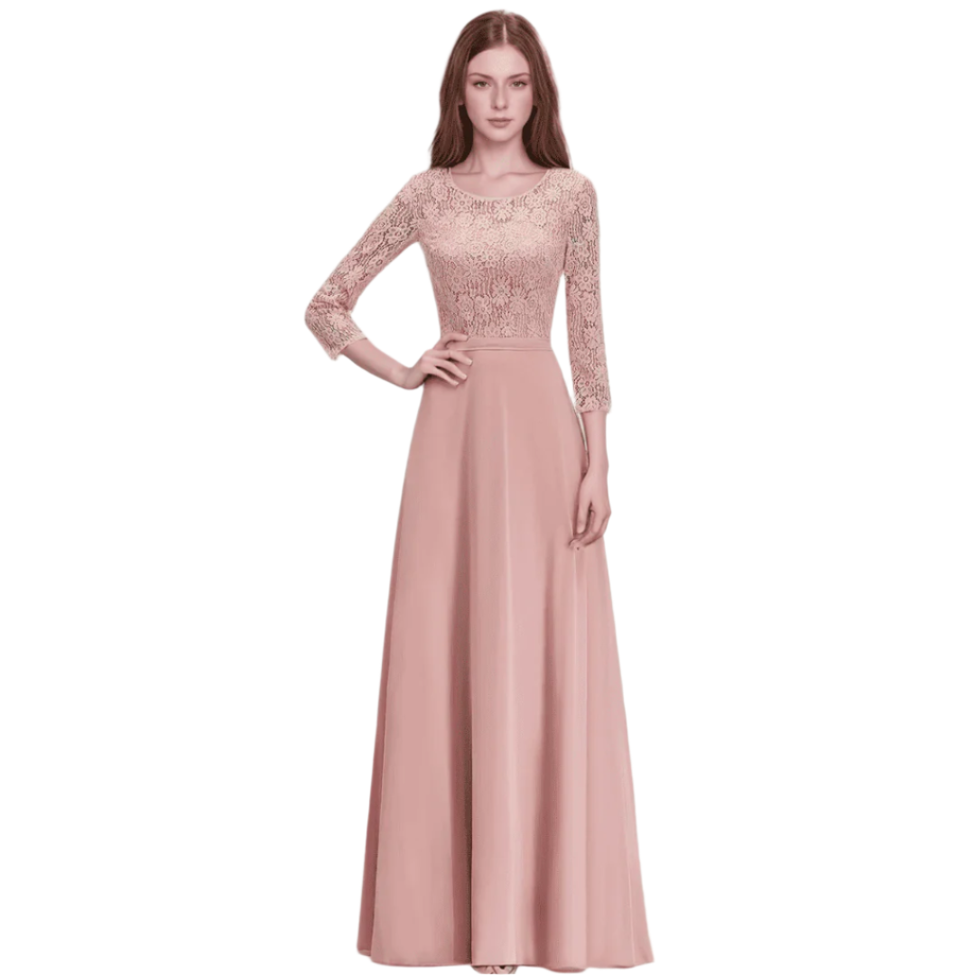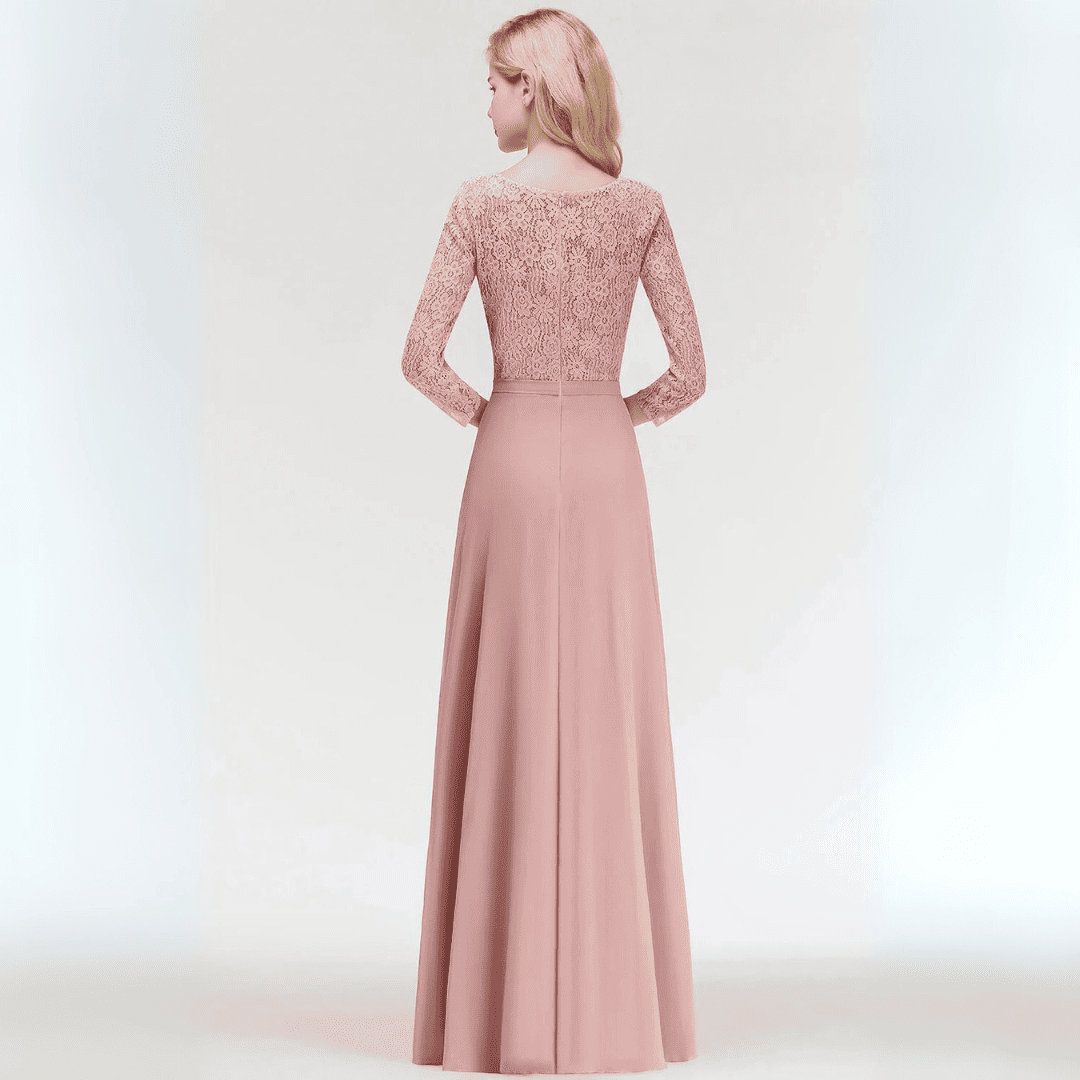 Ta długa sukienka dla druhen w kolorze pudrowego różu zachwyca klasyczną linią A oraz subtelnymi koronkowymi aplikacjami. Wykonana z delikatnego szyfonu, z dekoltem w kształcie łódki i rękawami 3/4, łączy elegancję z wygodą. Doskonały wybór na wesela i wieczorne uroczystości!