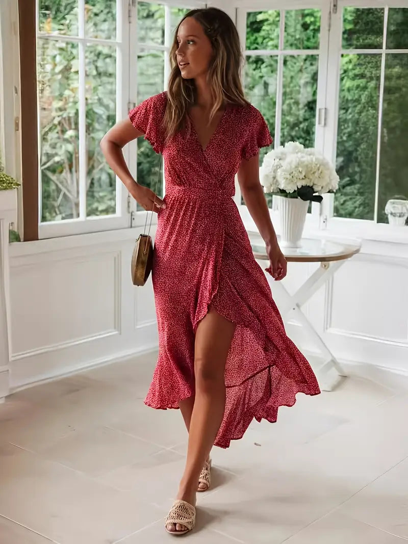 Elegancka sukienka midi z dekoltem w szpic i kwiatowym nadrukiem, zaprojektowana z myślą o pochlebnej sylwetce. Wykonana w 100% z poliestru, ta lekka tkanina zapewnia zarówno wygodę, jak i styl. Z paskiem w talii zapewniającym dopasowanie, ta sukienka jest idealna na wiosnę, lato i jesień.