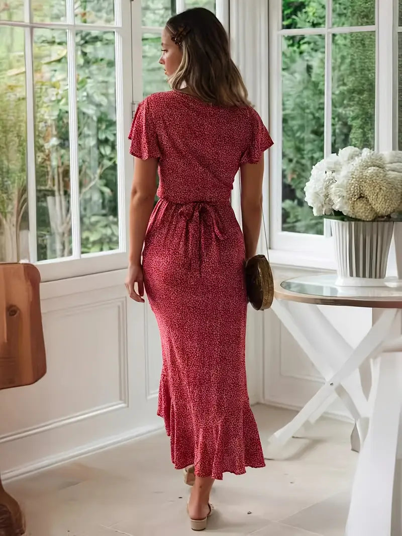 Ozdobna kwiatowa sukienka midi z dekoltem V i paskiem w talii