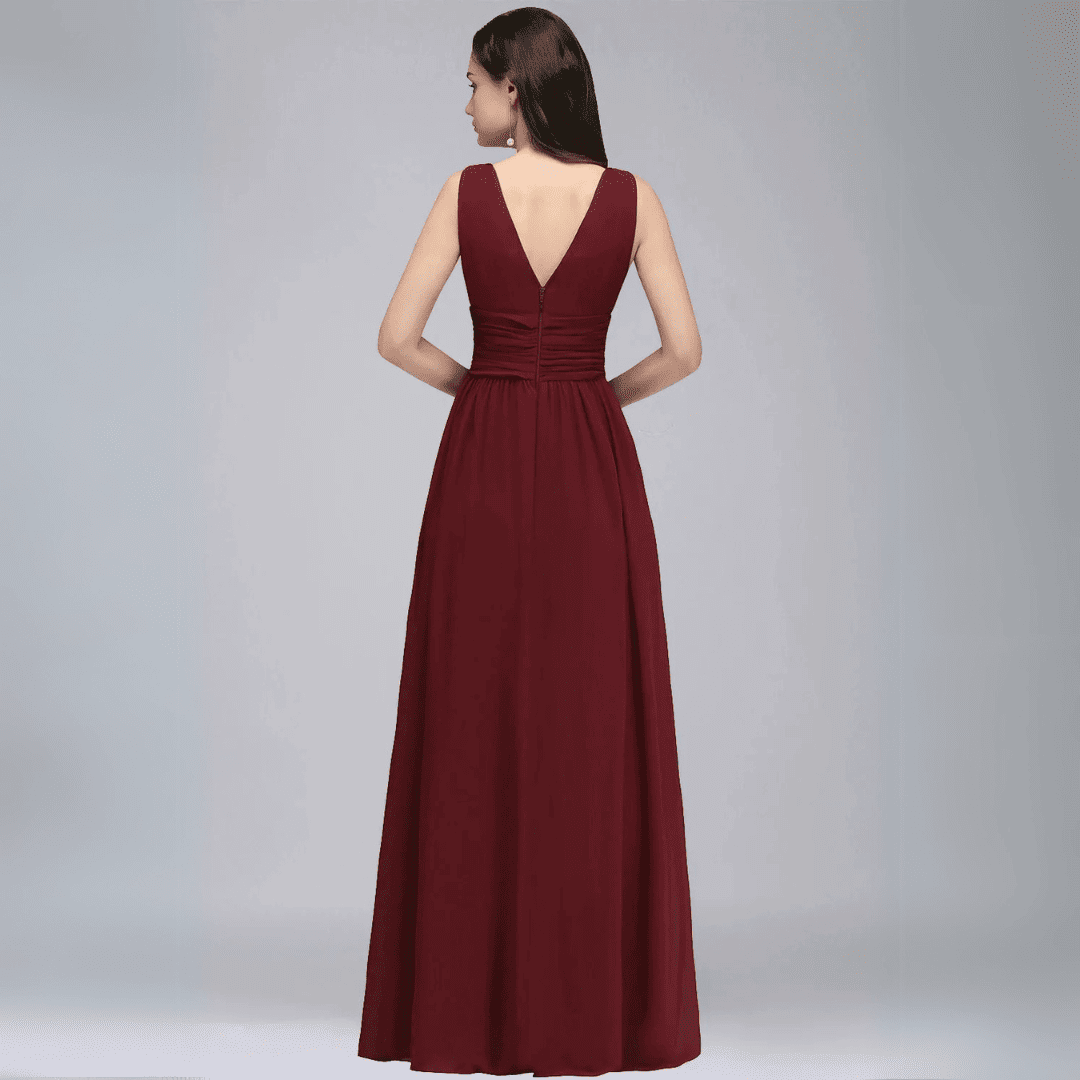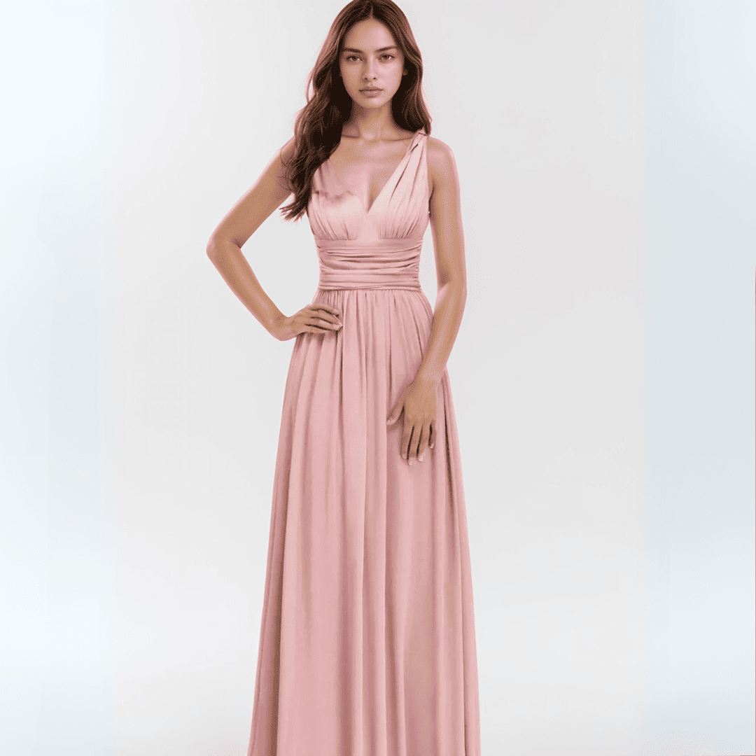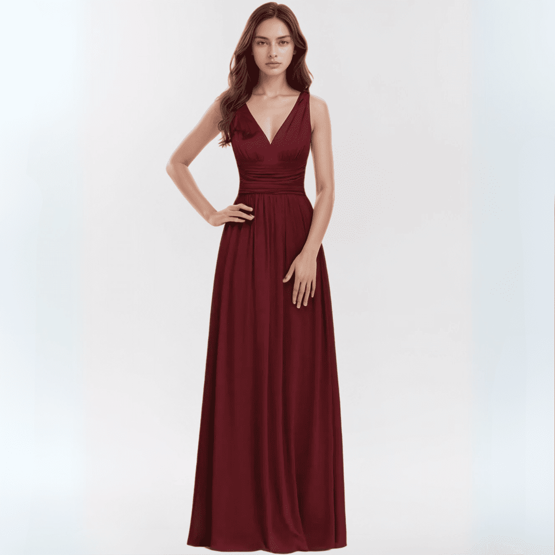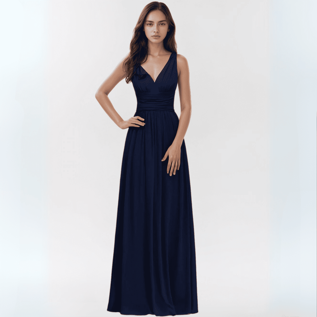 Zachwyć swoją druhnę niezwykłą, zwiewną suknią z dekoltem w literę V i krojem w kształcie litery A. Ta długa sukienka z lekkiego szyfonu dodaje elegancji i uroku każdej wyjątkowej okazji, zapewniając komfort i szyk przez cały wieczór.