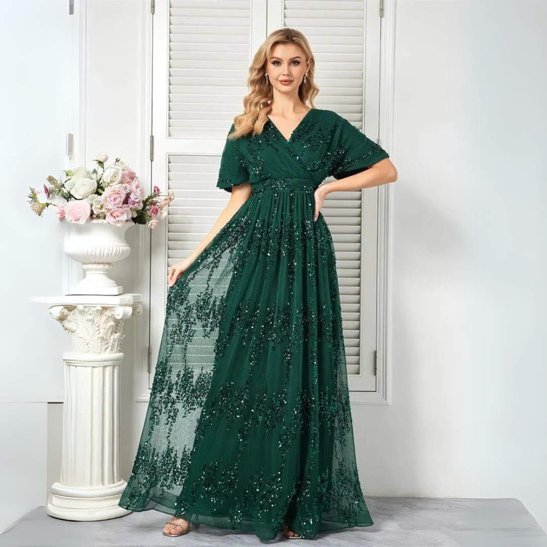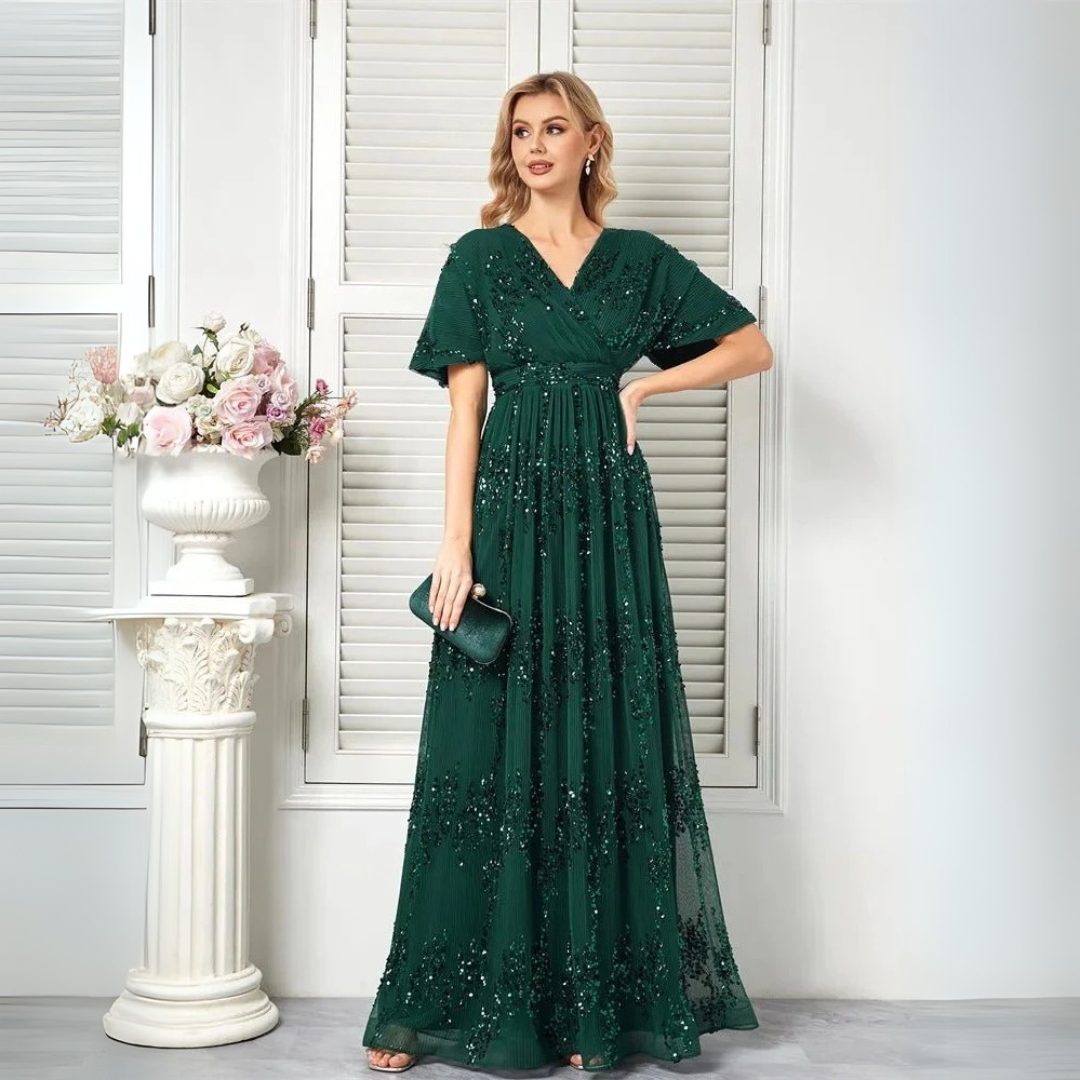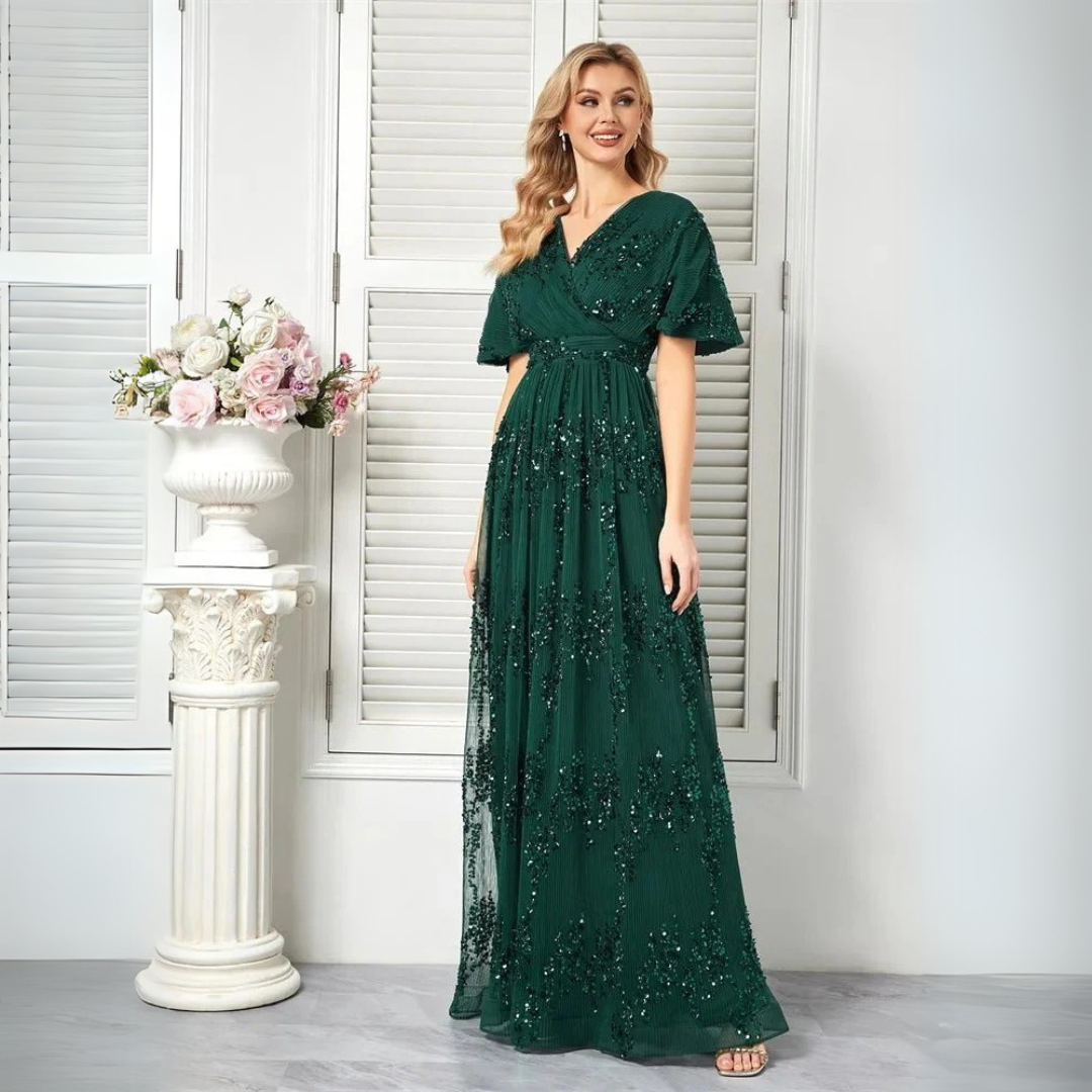 Zachwyć wszystkich na wyjątkowych okazjach w tej eleganckiej sukni w kształcie litery A z dekoltem w szpic. Lśniące koraliki i cekiny zdobią kwiatowy wzór, tworząc romantyczny, olśniewający wygląd. Szmaragdowa zieleń dodaje klasy i wyrafinowania.