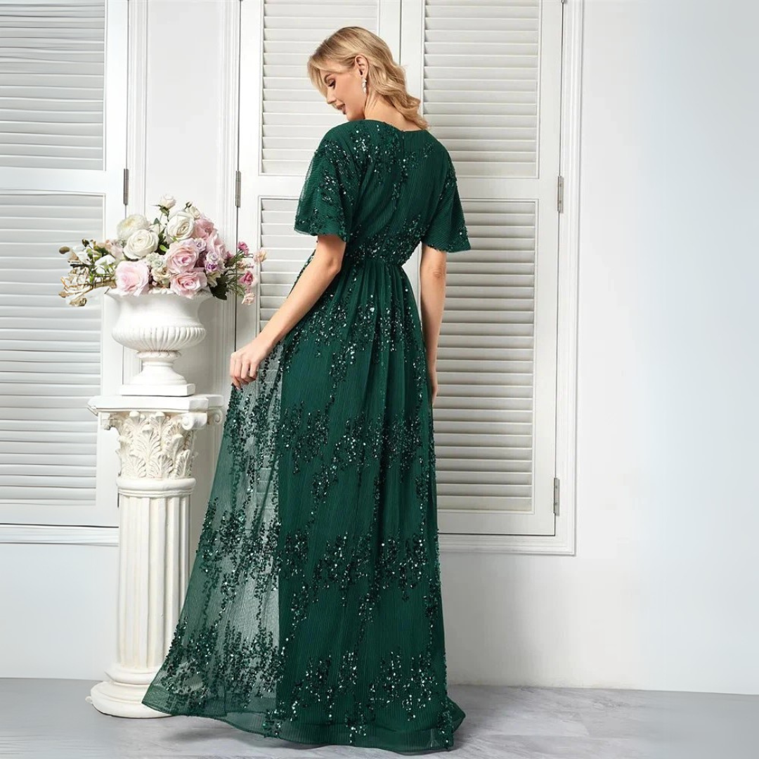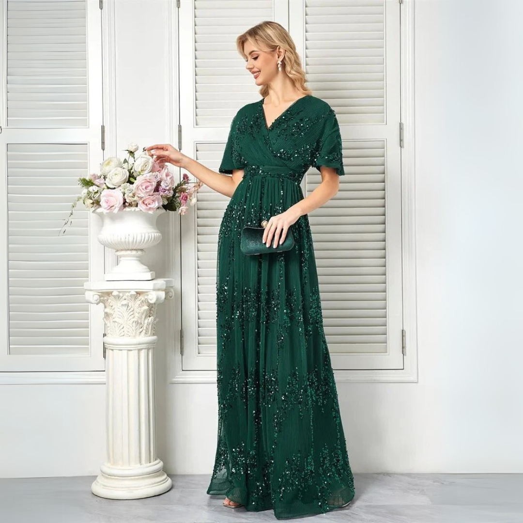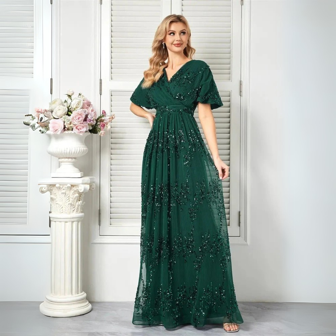 Zachwyć wszystkich na wyjątkowych okazjach w tej eleganckiej sukni w kształcie litery A z dekoltem w szpic. Lśniące koraliki i cekiny zdobią kwiatowy wzór, tworząc romantyczny, olśniewający wygląd. Szmaragdowa zieleń dodaje klasy i wyrafinowania.