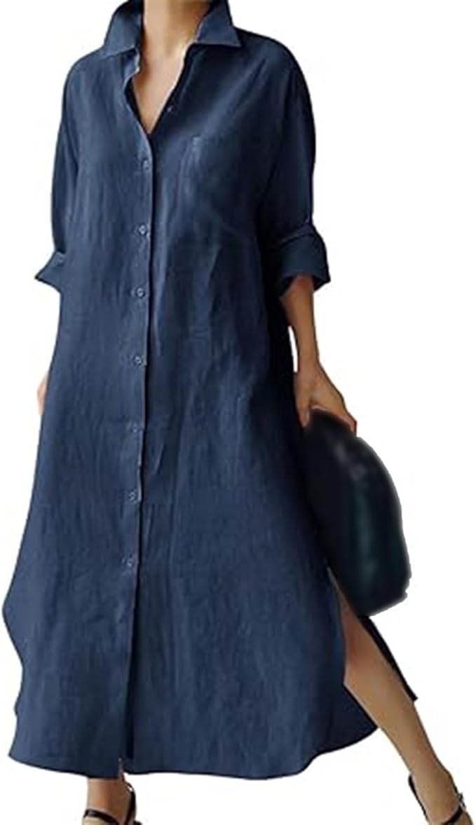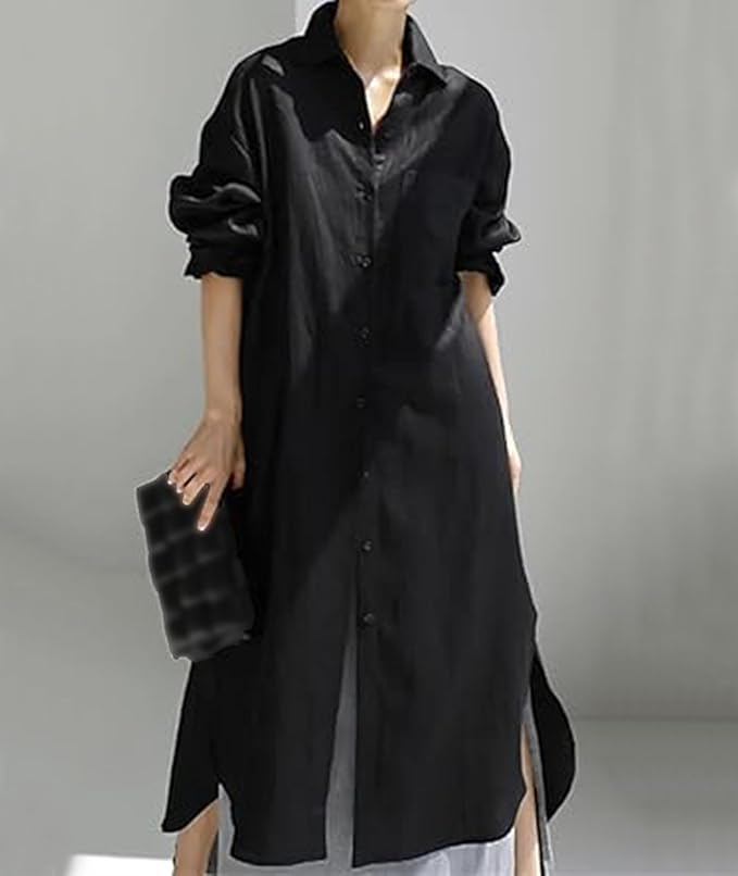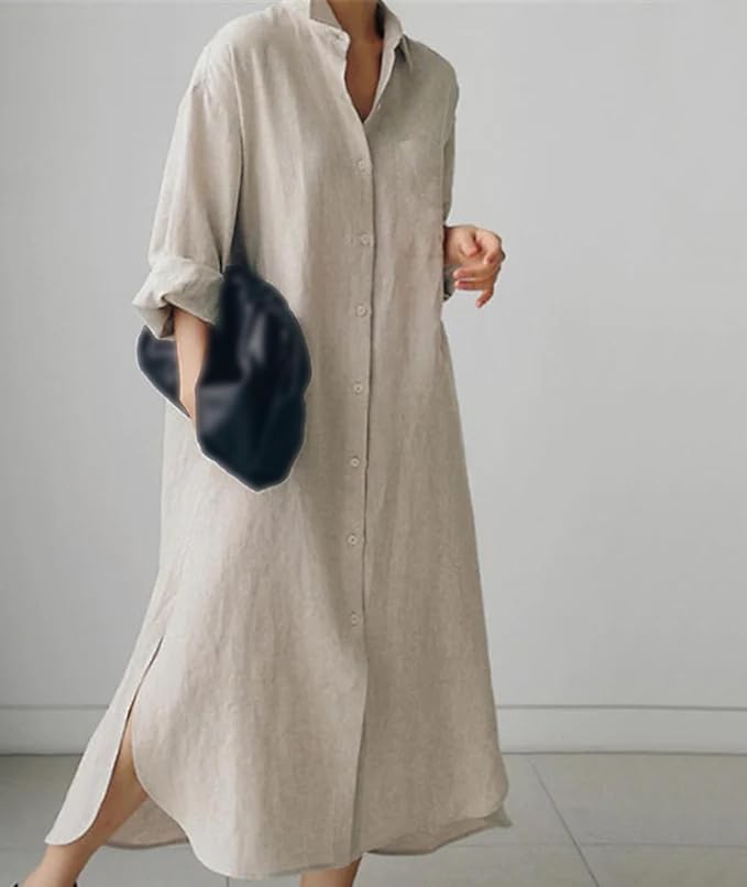 Ta elegancka bawełniano-lniana bluzka to idealne połączenie wygody i stylu. Przewiewny materiał zapewnia przyjemne uczucie noszenia, idealne na gorące letnie dni. Dzięki zapięciu na guziki i długim rękawom sukienkę można nosić zarówno swobodnie, jak i szykownie.