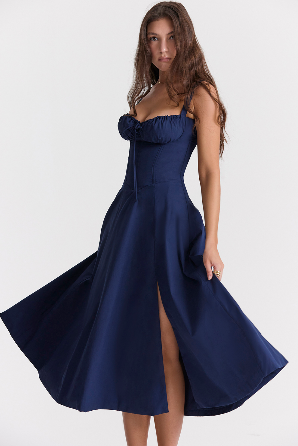 El Sophia, Ta sukienka midi w kolorze midnight blue to idealny wybór, jeśli szukasz stroju, który łączy w sobie styl i ponadczasowość - klasyka, której nie może zabraknąć w Twojej szafie!