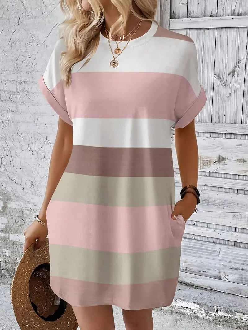Sukienka letnia - tunika z dzianiny poliestrowej w paski z okrągłym dekoltem, swobodna i wygodna
