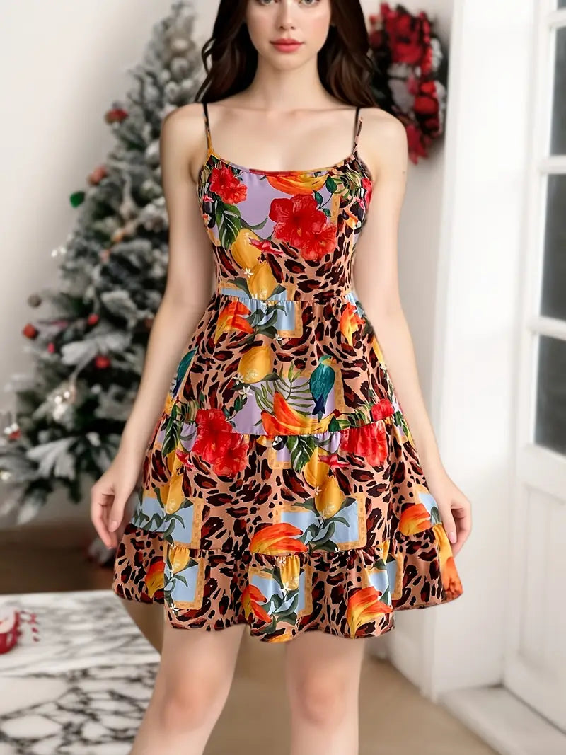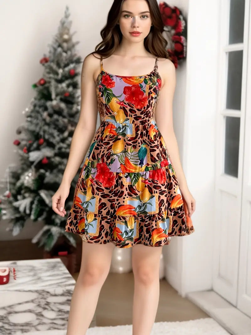 Sukienka mini z tropikalnym nadrukiem - kolorowa i letnia