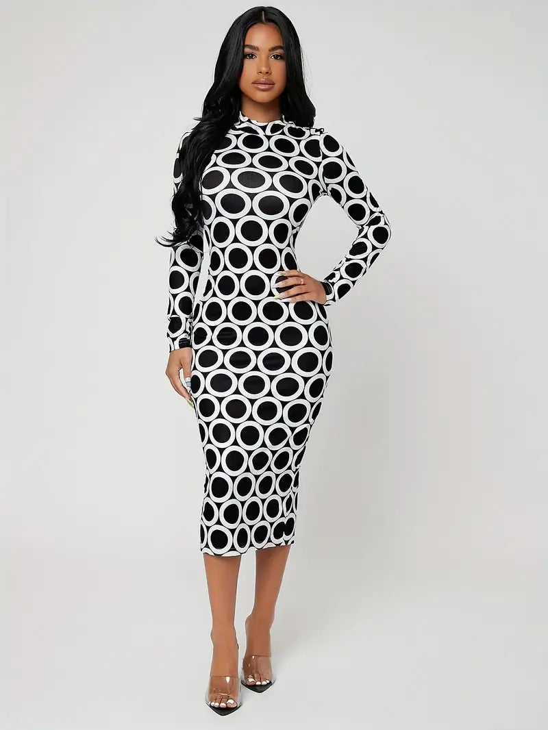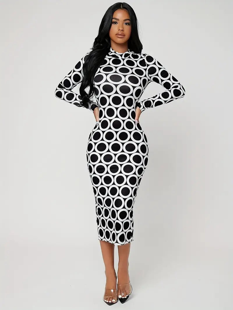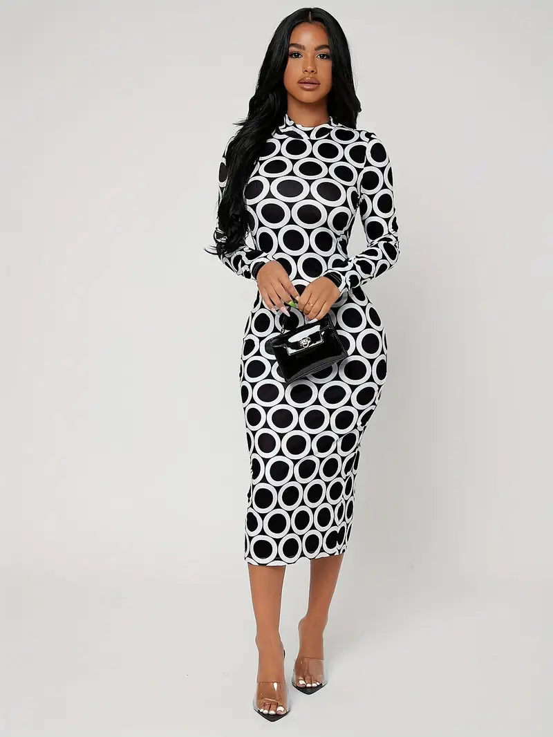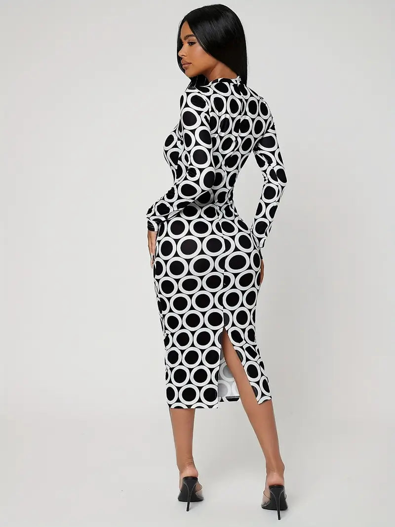 Zachowaj styl dzięki tej inspirowanej stylem retro sukience bodycon w kropki. Z rozcięciem u dołu i dopasowanym krojem, ta sukienka z długim rękawem jest idealna na wiosnę i jesień. Modny dodatek do garderoby, idealny na swobodne wyjścia lub specjalne okazje.