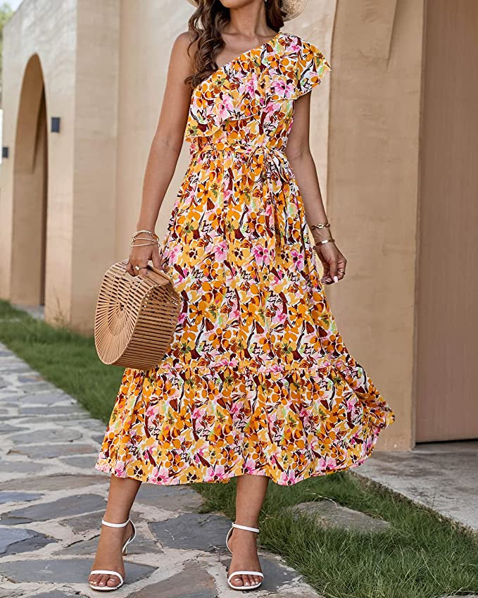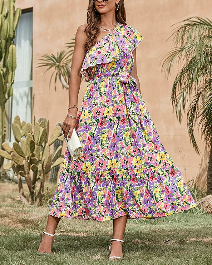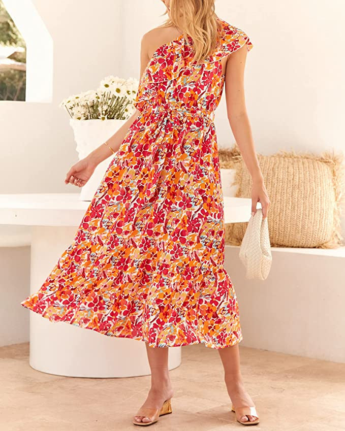 Sukienka w stylu boho bez rękawów z asymetrycznym ramiączkiem i wysokim stanem łączy oryginalny design z wygodą. Wysoki stan podkreśla sylwetkę a asymetryczne ramiączko nadaje jej nowoczesny charakter. Lekka przewiewna tkanina zapewnia komfort nawet w ciepłe dni. Żywe kwiatowe i roślinne wzory dodają sukience wyjątkowego uroku czyniąc ją idealnym wyborem na wakacje letnie przyjęcia i codzienne stylizacje. Dostępna w różnych rozmiarach gwarantuje swobodę ruchów i świetne dopasowanie.