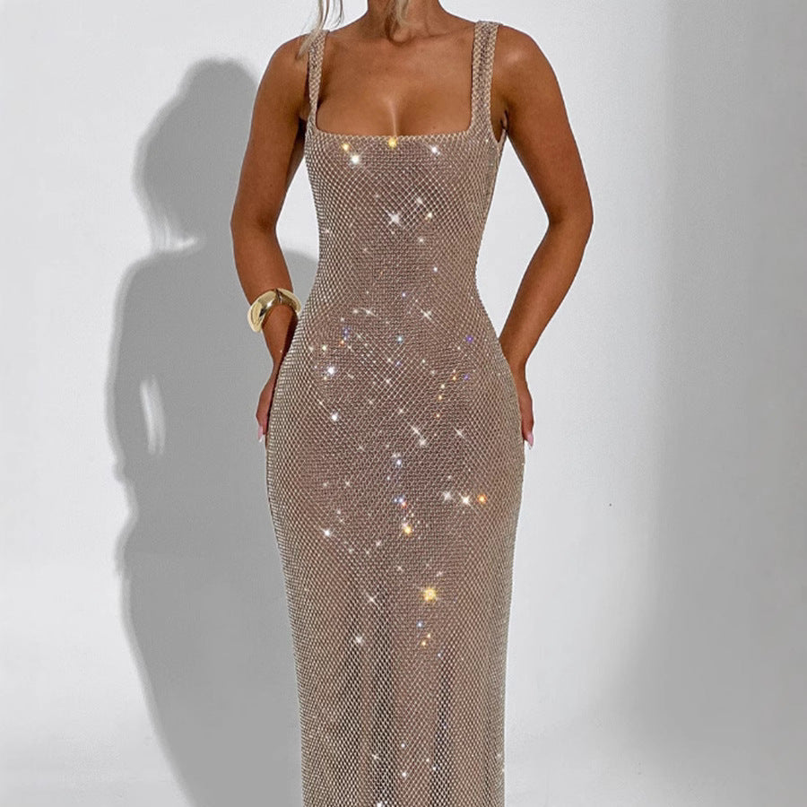 Sukienka z Podwójnymi Ramiączkami i Cekinami z Detalem z Siatki | Idealna na Wiosnę i Lato