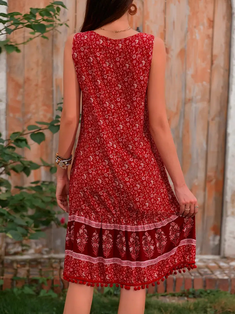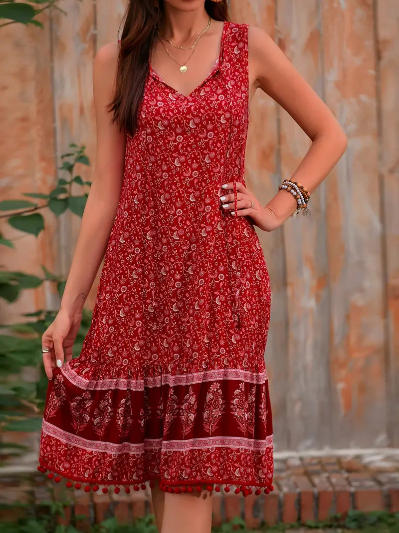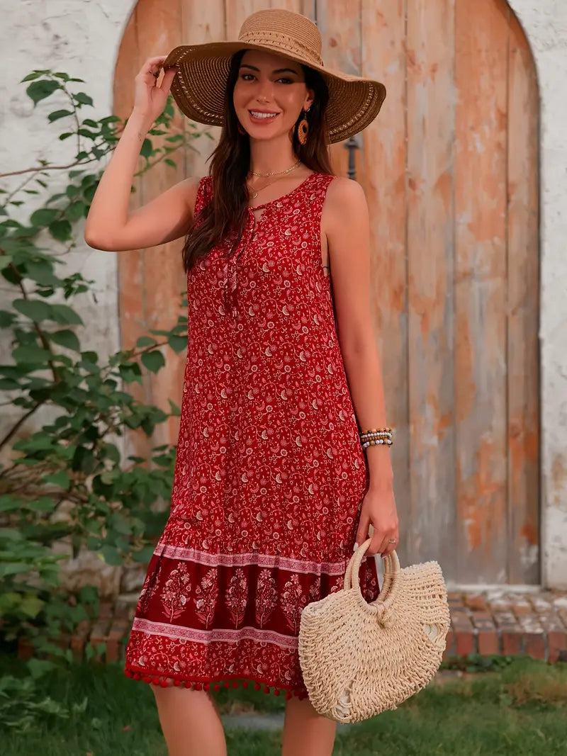 Swobodna i elegancka sukienka letnia - dekolt w szpic, kwiatowy nadruk, bez rękawów, idealna na plażę i do miasta