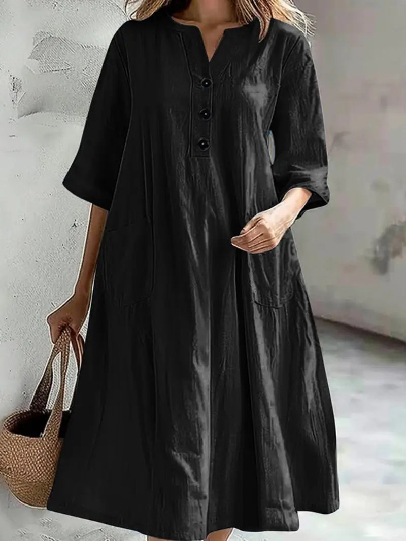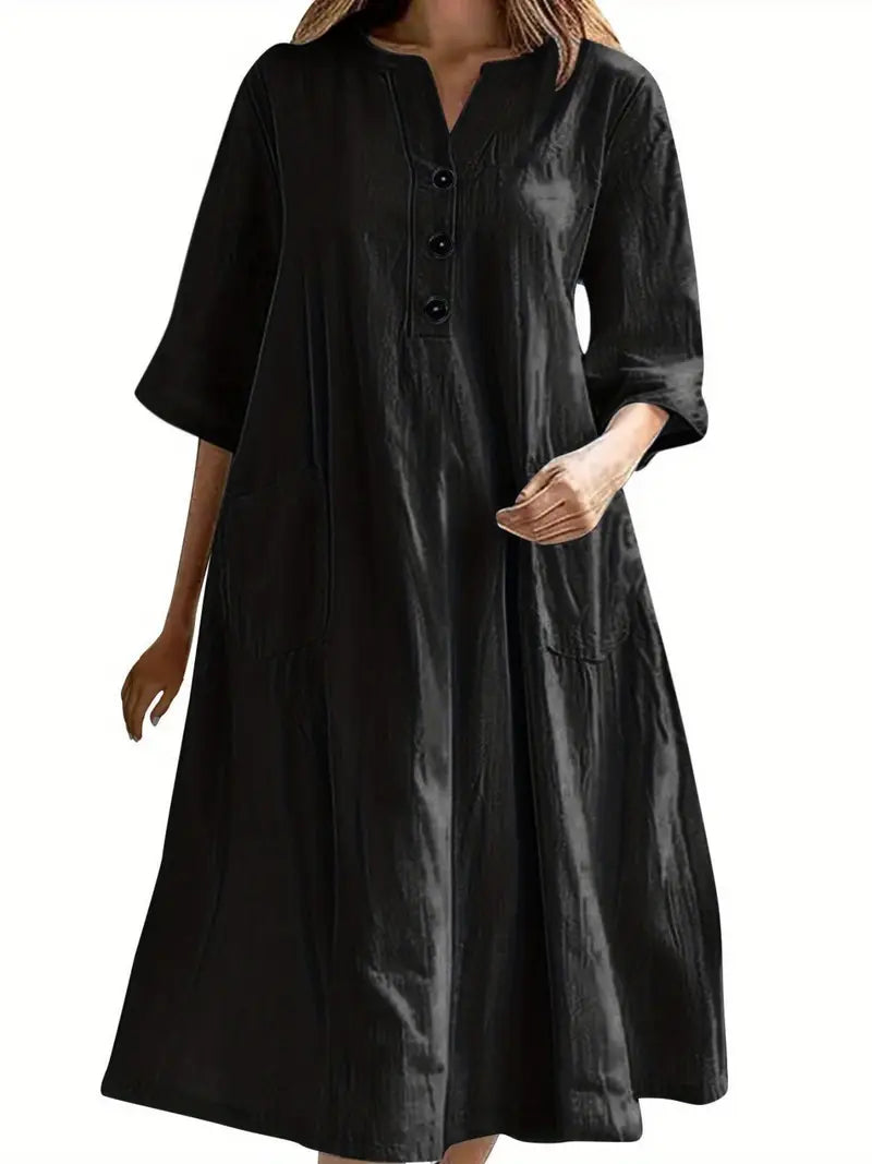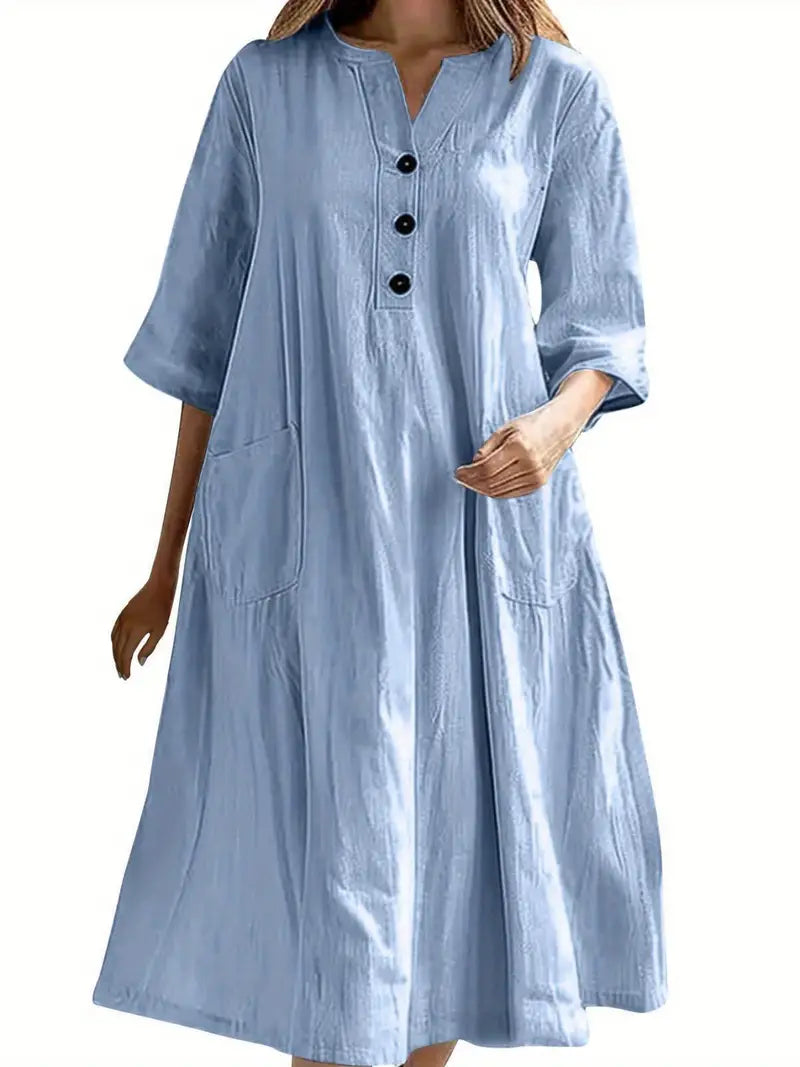 Szykowna sukienka midi z dekoltem V i zapięciem na guziki - Elegancki letni styl z kieszeniami