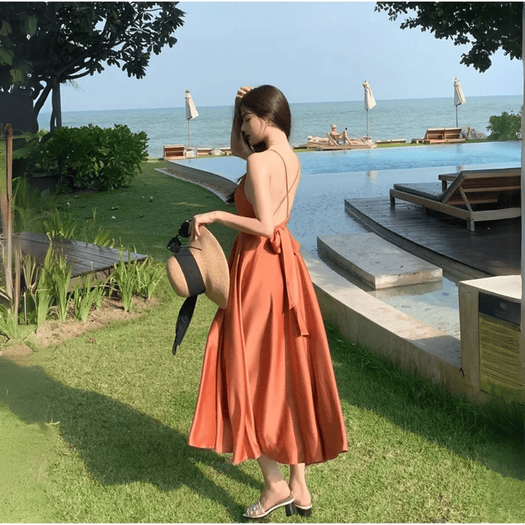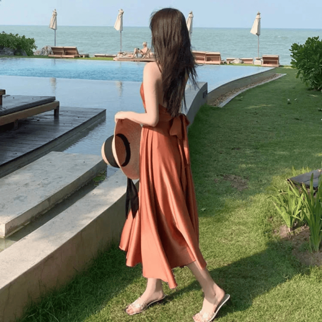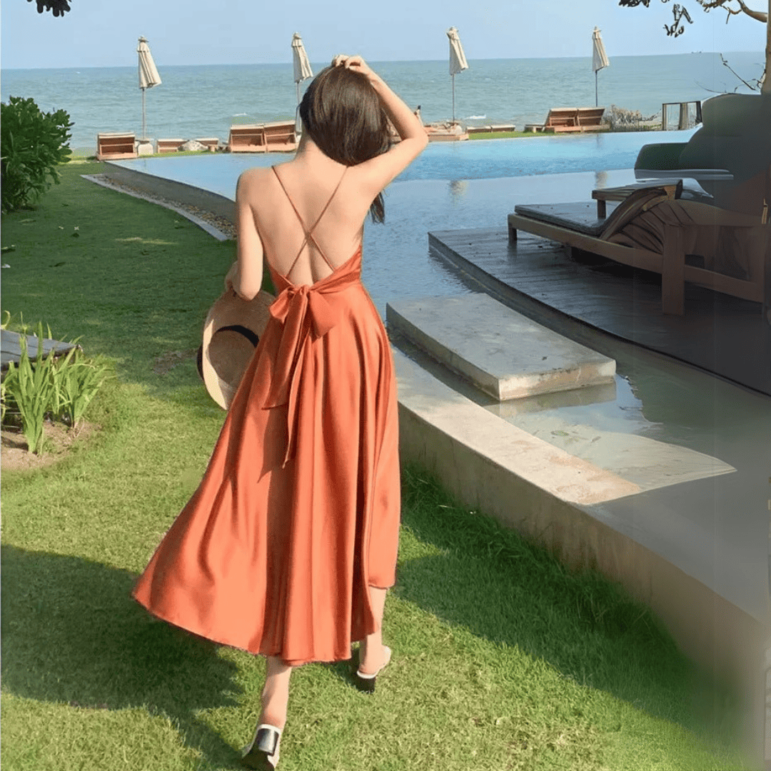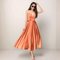 Wkrocz w świat wyrafinowania z naszą satynową sukienką w kolorze terakoty o długości tea, wyposażoną w głęboki dekolt w kształcie litery V i delikatne ramiączka spaghetti, które tworzą elegancką sylwetkę. Idealna dla druhen, ta odsłaniająca plecy kreacja to nowoczesne spojrzenie na klasyczną weselną stylizację, które zapewni Ci wyjątkowy wygląd pełen wdzięku.