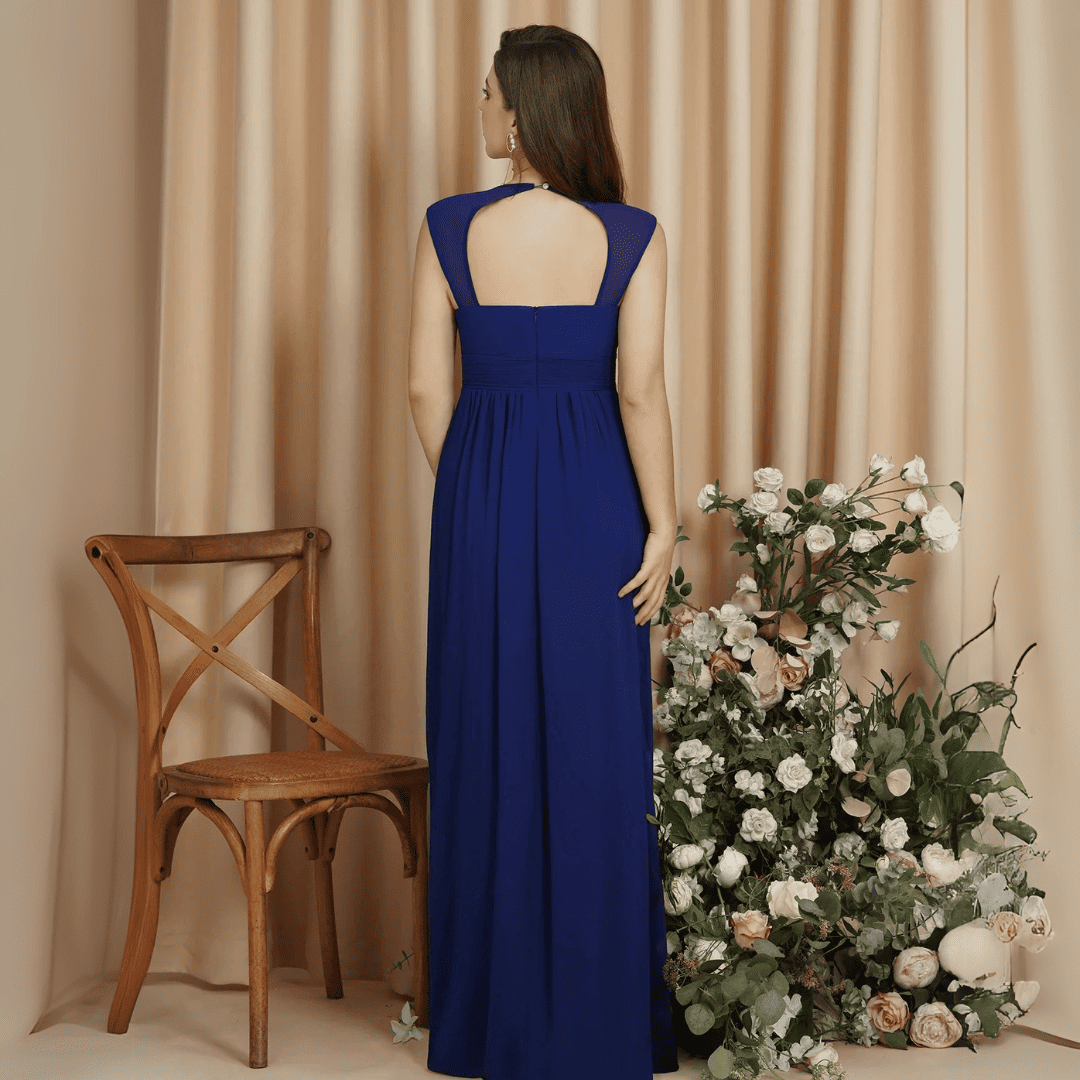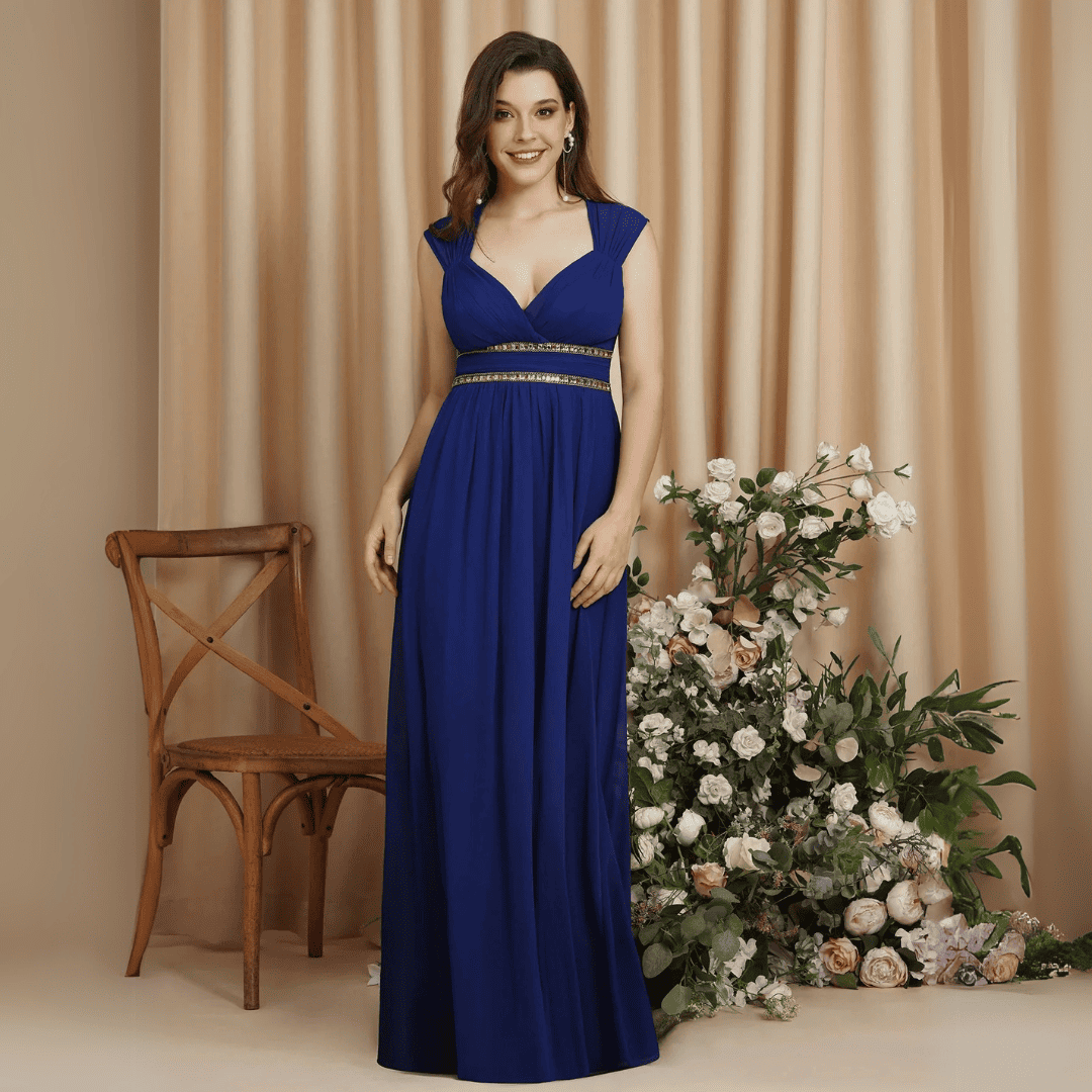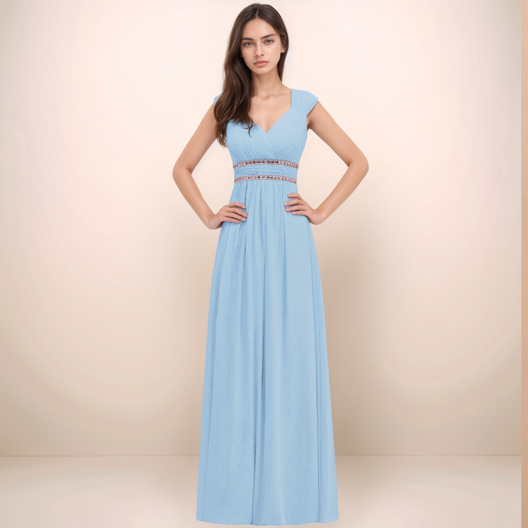 Podnieś rangę swojej drużyny druhen dzięki ponadczasowej sukni, która łączy w sobie wyrafinowanie i nowoczesny styl. Z dekoltem w kształcie litery V, delikatnymi rękawami typu cap oraz ozdobnym paskiem z koralików, ta szyfonowa suknia o kroju A-line zapewnia niezrównaną grację i wygodę. Dostępna w kolorze królewskiego błękitu oraz innych odcieniach, będzie idealnym wyborem na Twój wyjątkowy dzień.