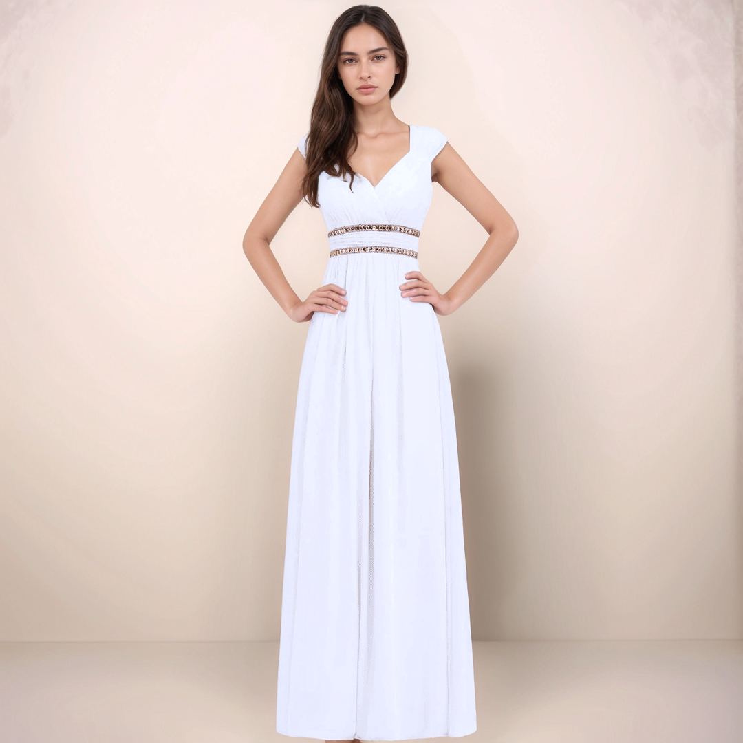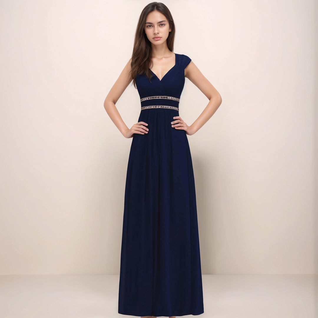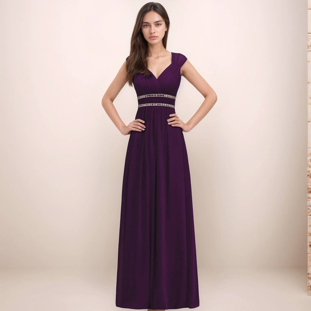 Podnieś rangę swojej drużyny druhen dzięki ponadczasowej sukni, która łączy w sobie wyrafinowanie i nowoczesny styl. Z dekoltem w kształcie litery V, delikatnymi rękawami typu cap oraz ozdobnym paskiem z koralików, ta szyfonowa suknia o kroju A-line zapewnia niezrównaną grację i wygodę. Dostępna w kolorze królewskiego błękitu oraz innych odcieniach, będzie idealnym wyborem na Twój wyjątkowy dzień.