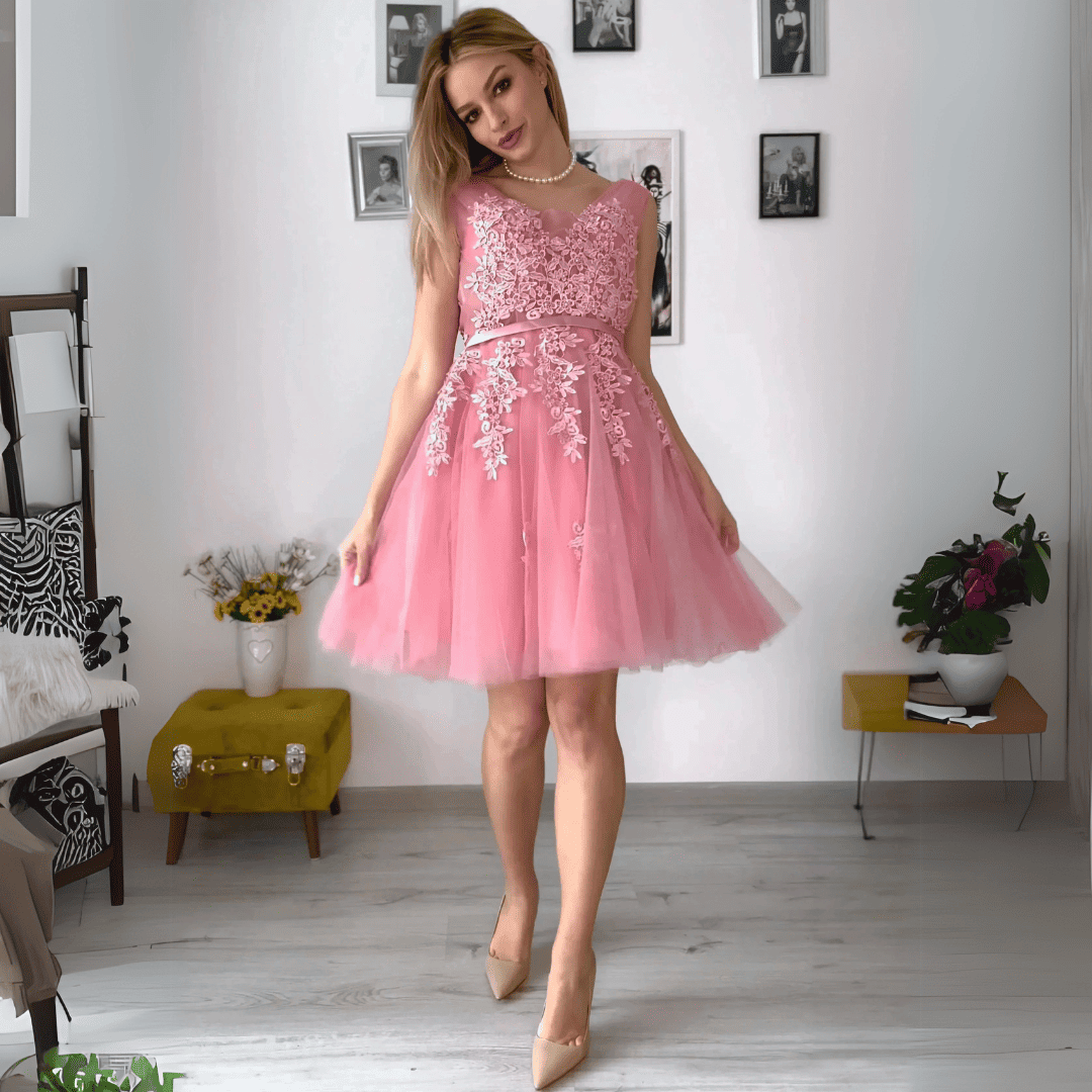 Postaw na elegancję w naszej tiulowej sukience o kroju A, z romantycznym dekoltem w kształcie litery V i uroczymi kwiatowymi aplikacjami. Idealna na bal maturalny lub przyjęcie, ta sukienka do kolan doskonale łączy wyrafinowanie z wygodą, sprawiając, że będziesz błyszczeć na każdej uroczystości.