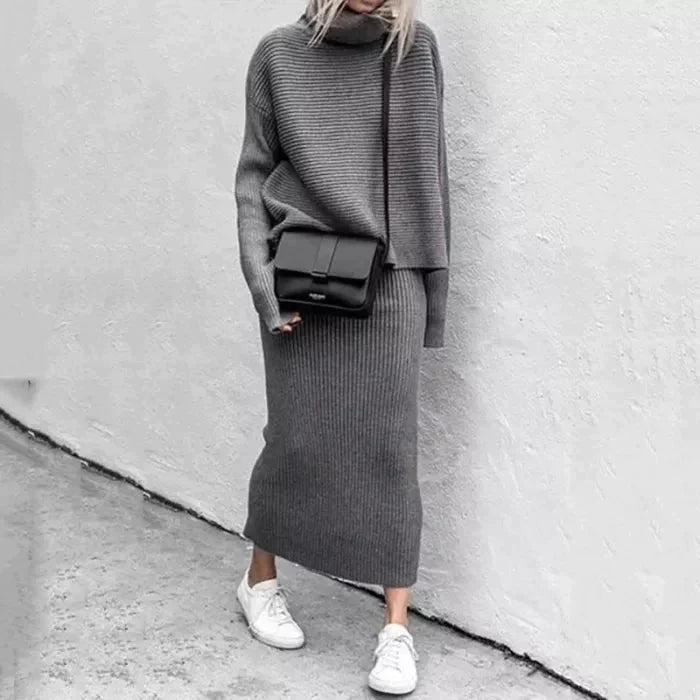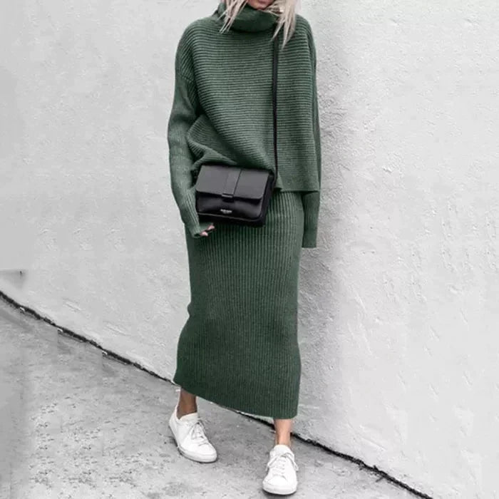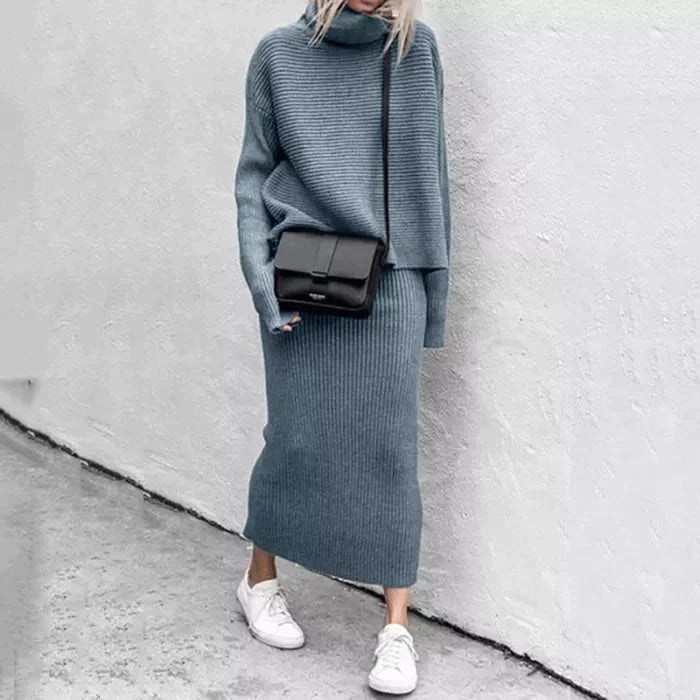 Nasz komplet składa się z luźnego swetra z golfem i długim rękawem oraz średniej długości spódnicy z wysokim stanem. Wykonane z wysokiej jakości, miękkiej, termicznej i rozciągliwej dzianiny ściągaczowej.