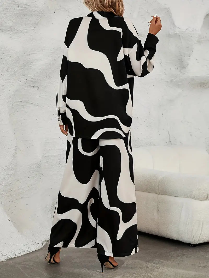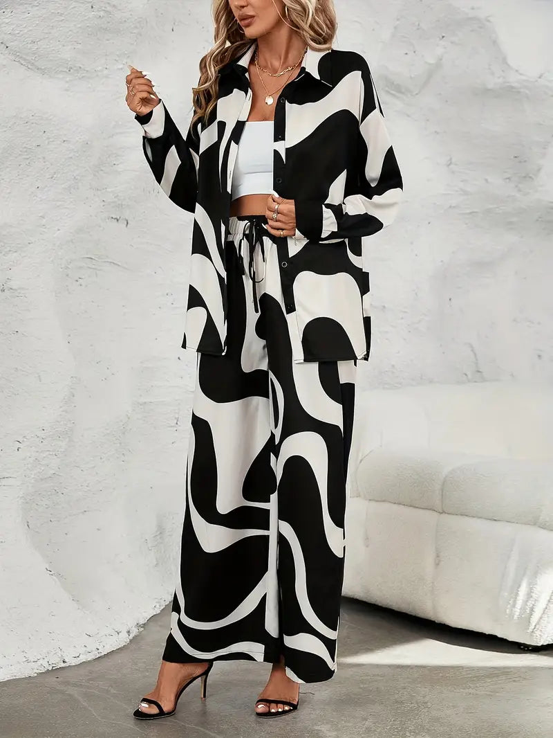 Damski zestaw na co dzień z blokami kolorów, bluzka z długim rękawem i szerokie spodnie