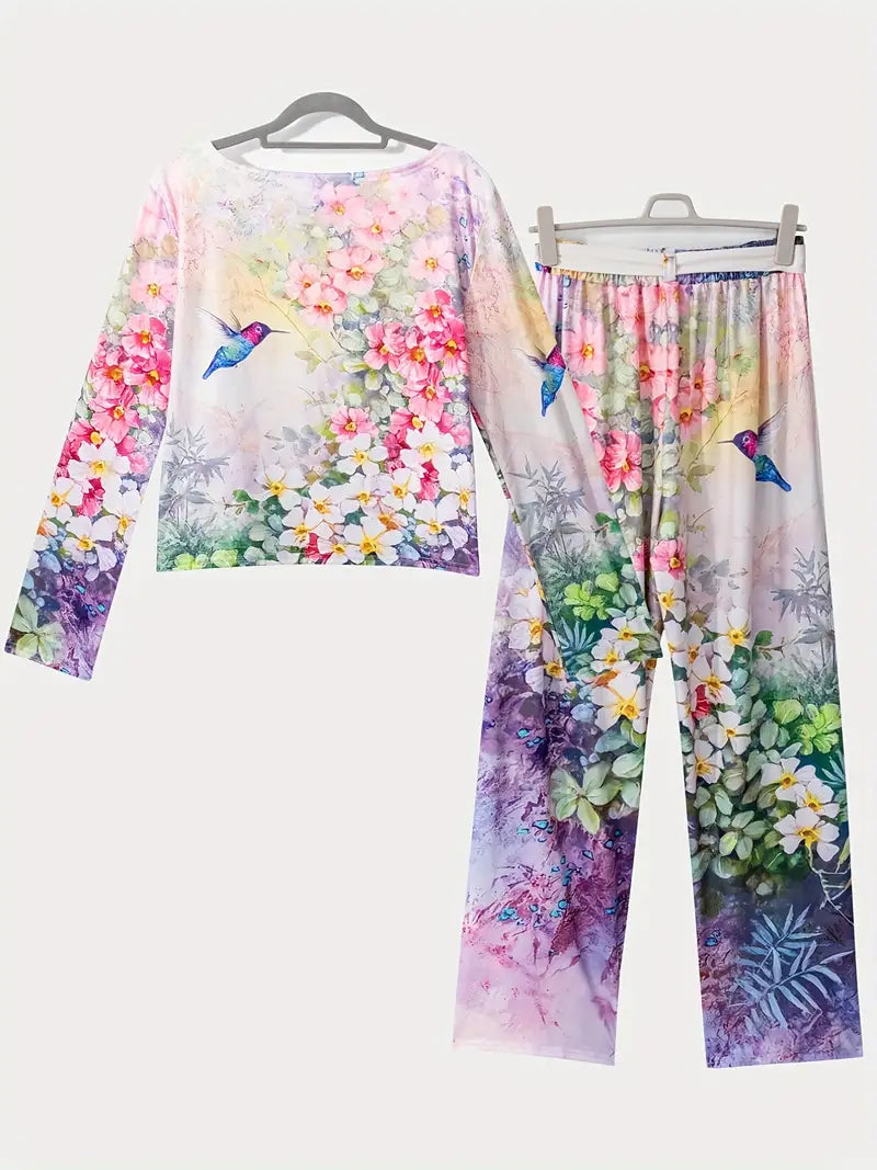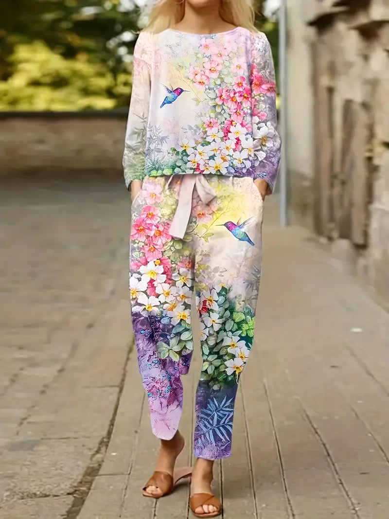 Zestaw z nadrukiem kwiatów i ptaków, bluzka z długim rękawem i spodnie z paskiem