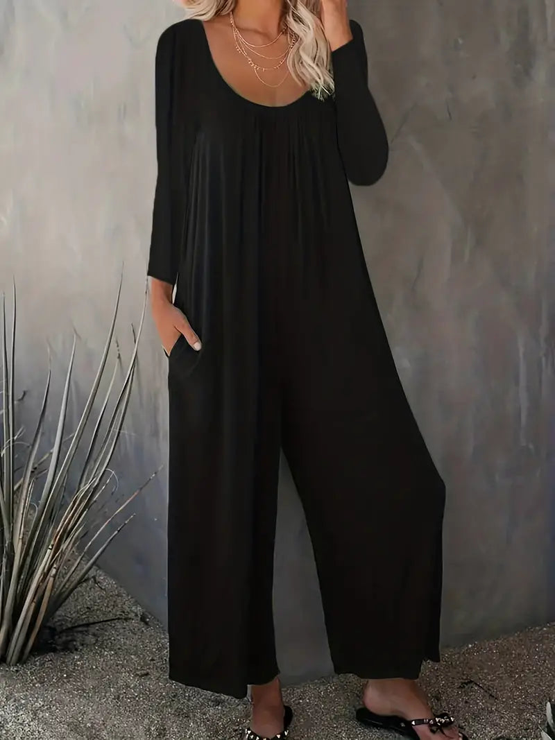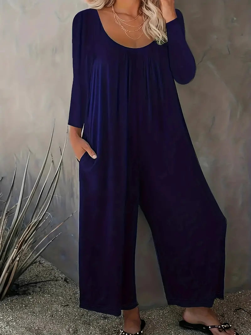 Nasz kombinezon z szerokimi nogawkami Plus jest uosobieniem swobodnego komfortu z odrobiną elegancji. Ten kombinezon z szerokimi nogawkami zapewnia swobodę ruchów i dopasowany krój, dzięki czemu czujesz się komfortowo. Długie rękawy zapewniają dodatkową osłonę i sprawiają, że nadaje się na różne okazje. Wyposażony w praktyczne kieszenie, oferuje zarówno styl, jak i funkcjonalność. Niezależnie od tego, czy załatwiasz sprawy, czy odpoczywasz w domu, ten kombinezon z pewnością stanie się ulubionym elementem Twojej szafy, ponieważ bez wysiłku łączy wygodę i styl.