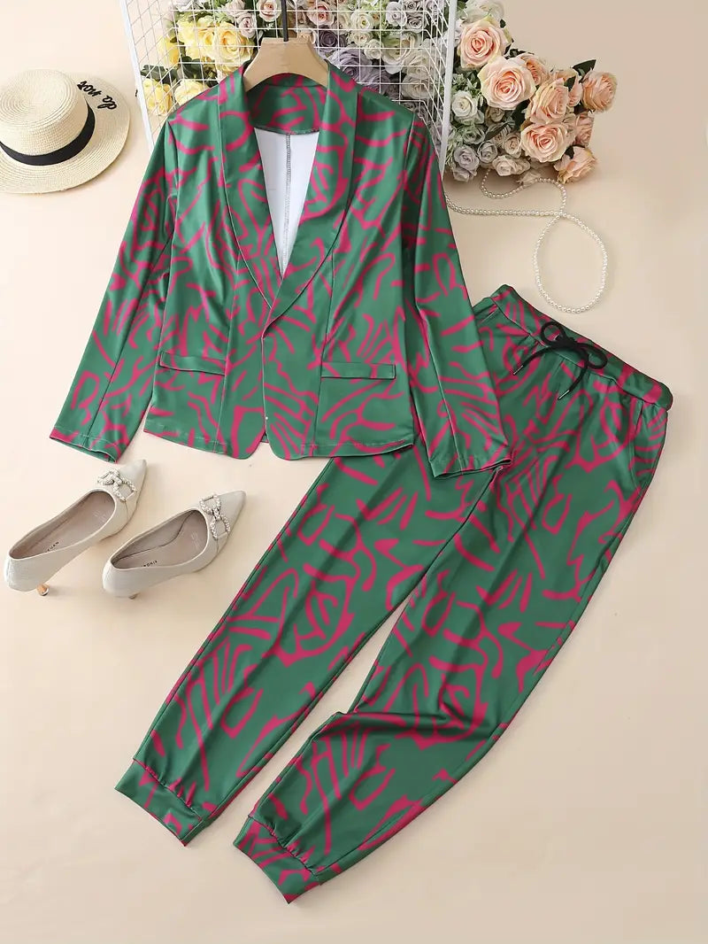 Wzbogać swoją garderobę naszym dwuczęściowym zestawem z abstrakcyjnym nadrukiem, składającym się ze stylowej marynarki i pasujących spodni ze sznurkiem. Ten wszechstronny strój, idealny do dodania odrobiny wyrafinowania do codziennego stroju, zapewnia wygodę i styl. Abstrakcyjny nadruk nadaje mu nowoczesny charakter i sprawia, że ​​nadaje się na różne okazje. Niezależnie od tego, czy wybierasz się do biura, czy na weekendowy brunch, ten zestaw bez trudu łączy modę i funkcjonalność.