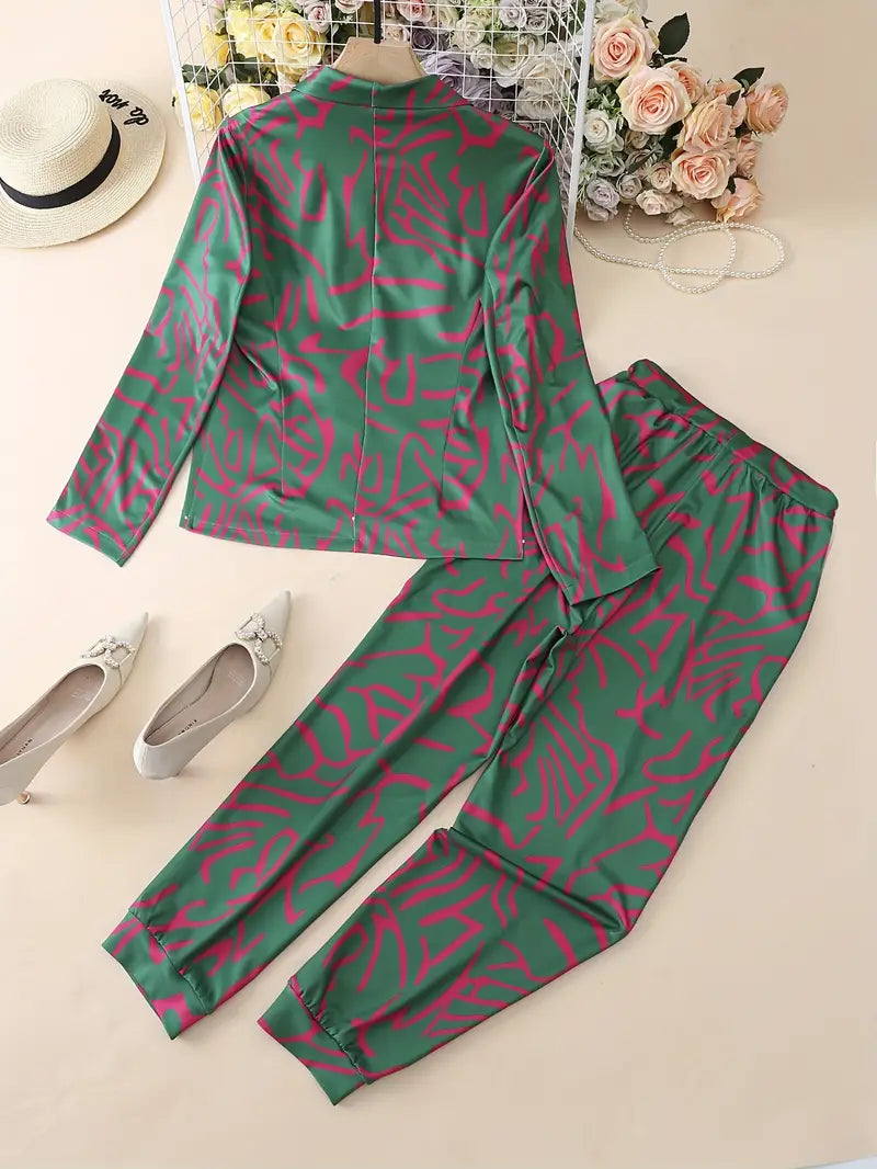 Dwuczęściowy komplet: marynarka i spodnie w abstrakcyjny wzór