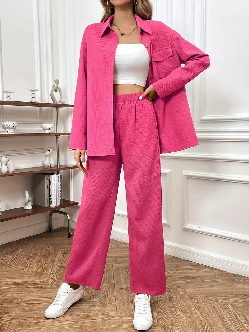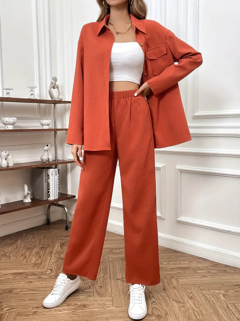 Ubierz się elegancko dzięki naszemu dwuczęściowemu zestawowi wykonanemu z wytrzymałej tkaniny waflowej. Ten wszechstronny zestaw składa się z koszuli z opuszczonymi ramionami i spodni z wysokim stanem, które zapewniają stylowy, ale wygodny wygląd. Miękka tkanina waflowa zapewnia przytulne uczucie, oferując jednocześnie modną estetykę. Idealny do wylegiwania się w domu lub swobodnego wyjścia, ten zestaw bez wysiłku poprawi Twój codzienny styl.