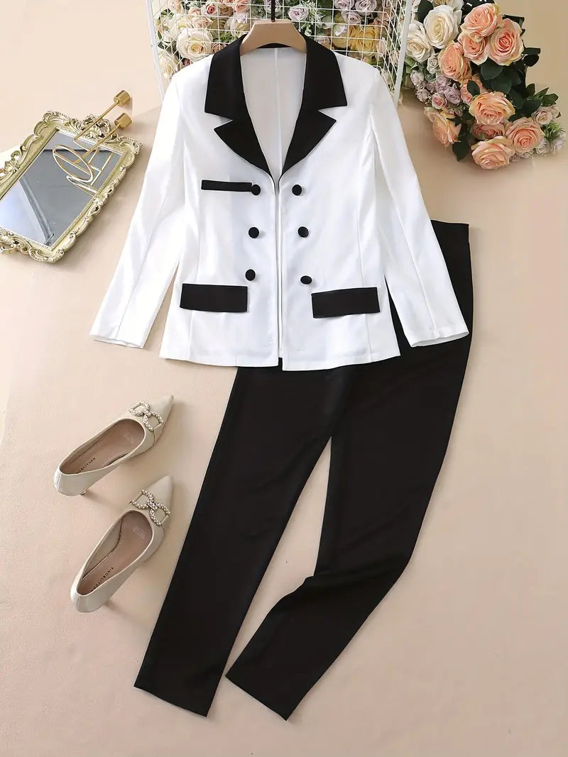 Dwuczęściowy zestaw składający się z marynarki i spodni z prostymi nogawkami zapinanych na guziki.