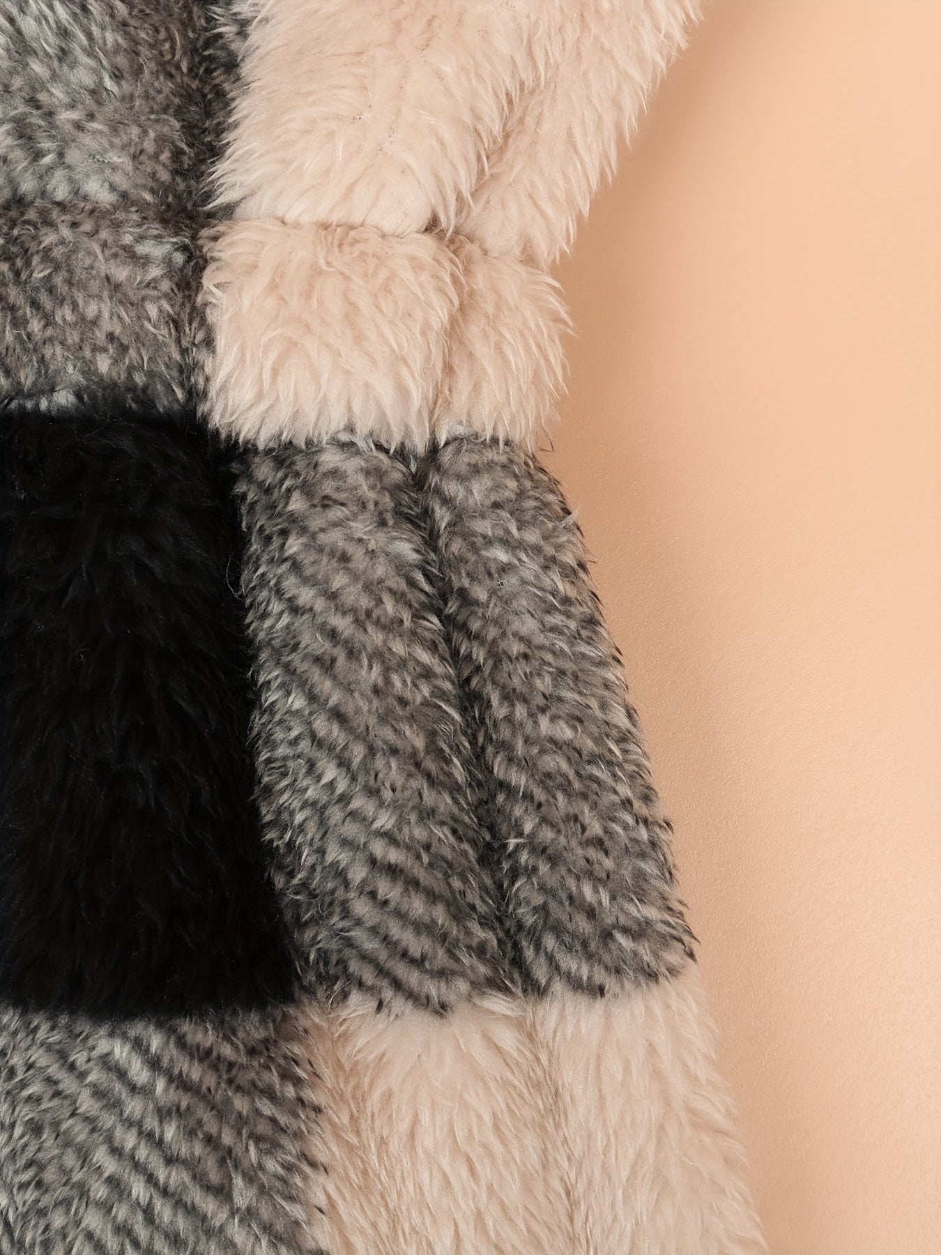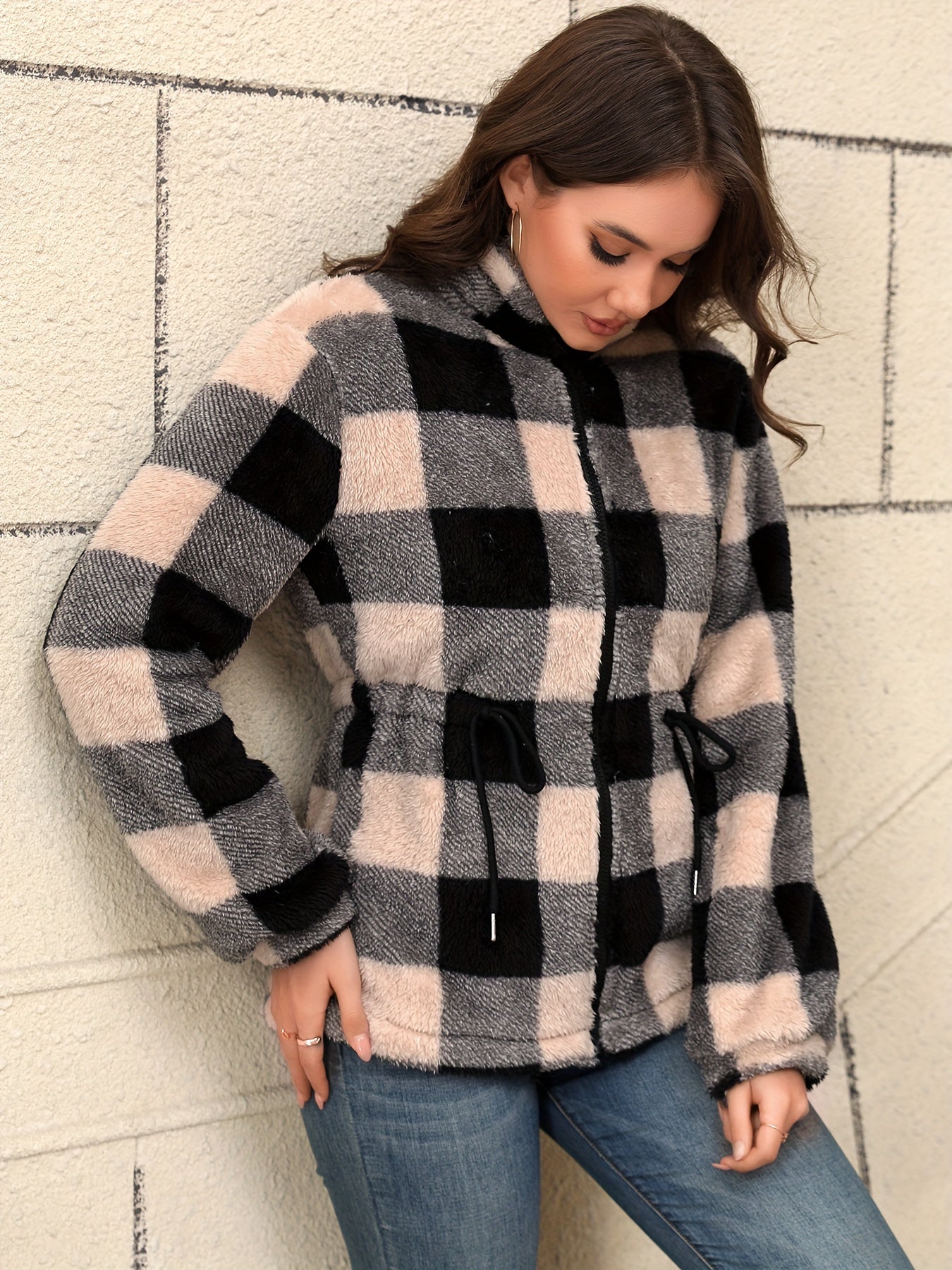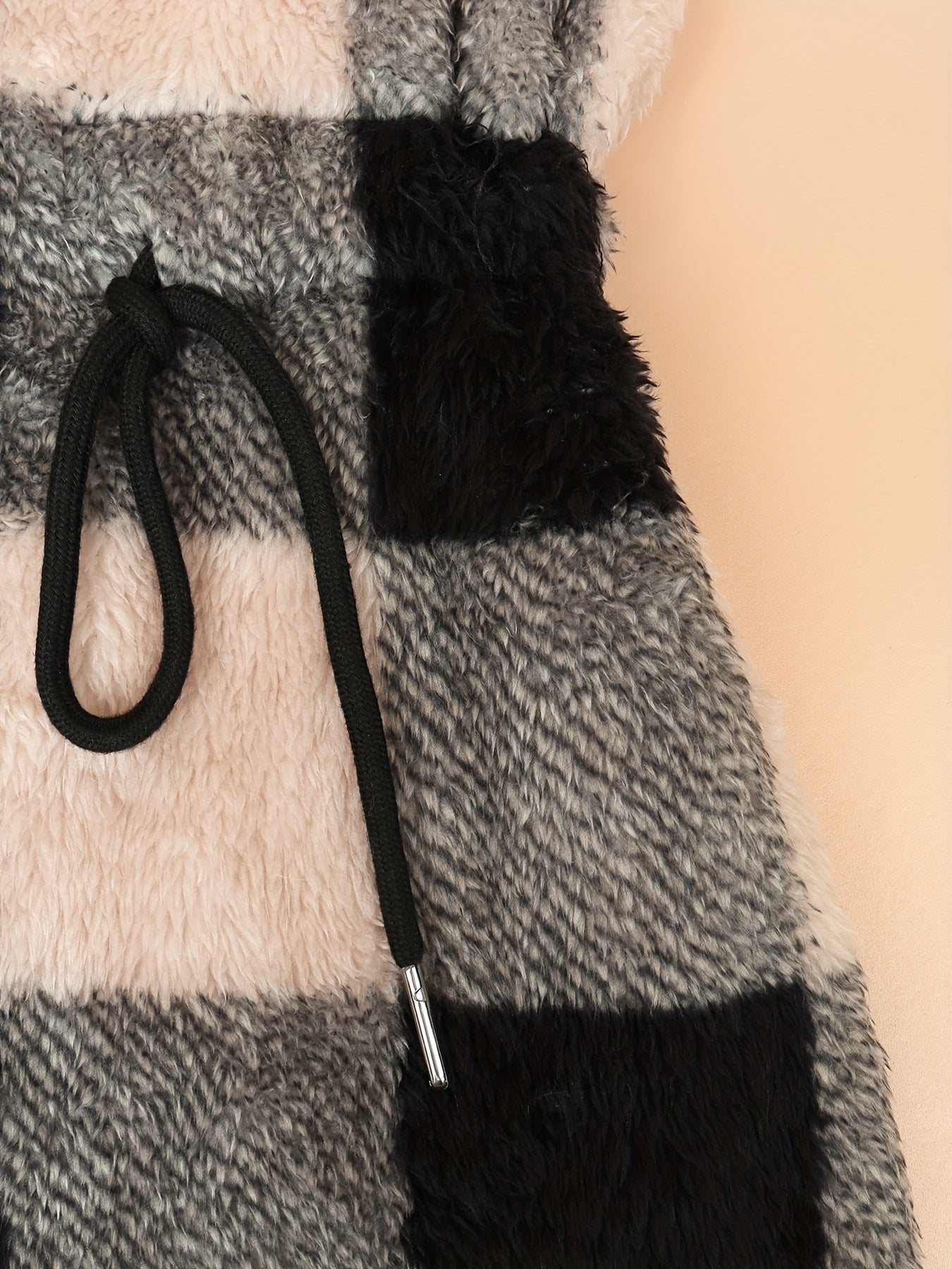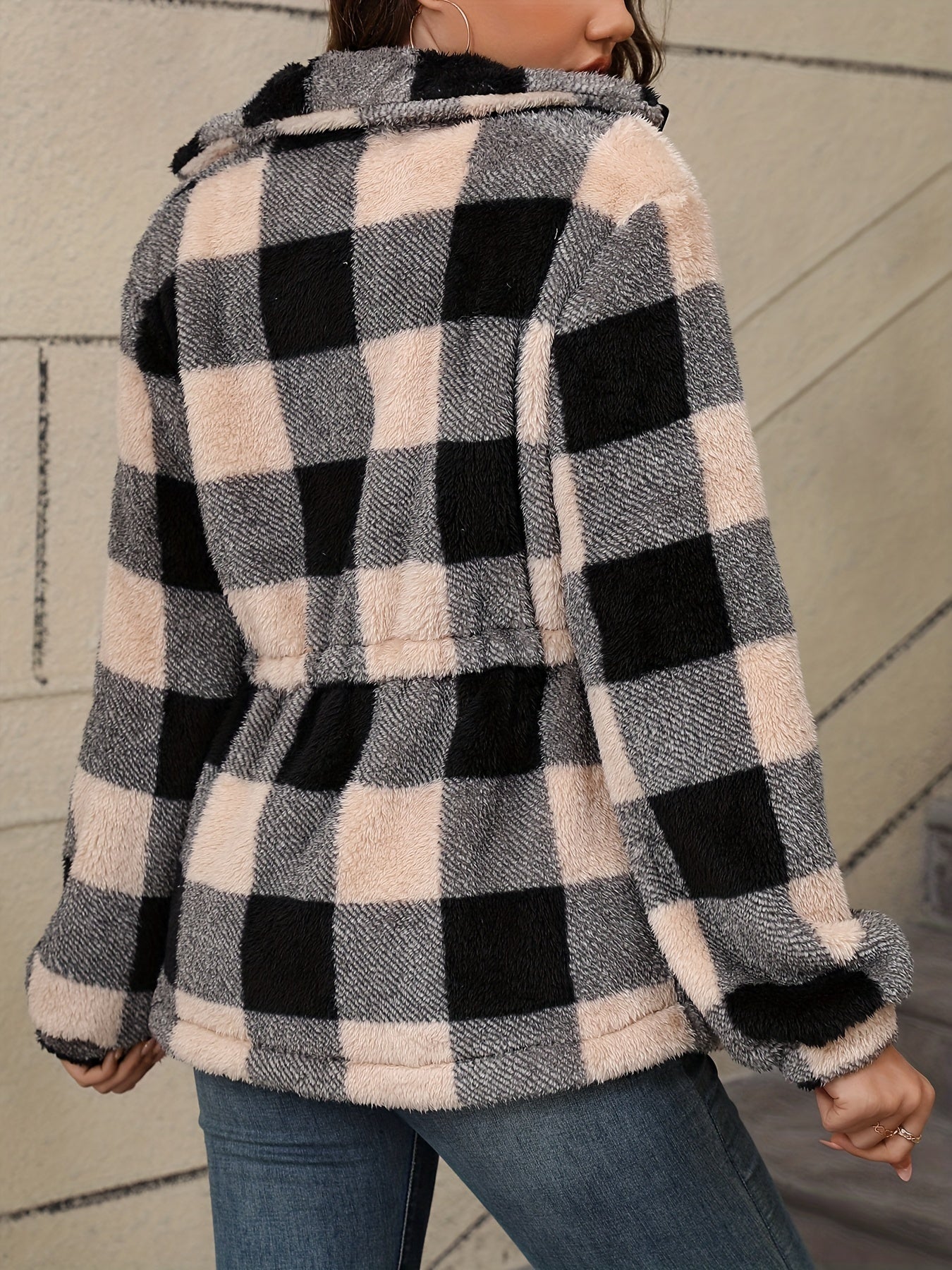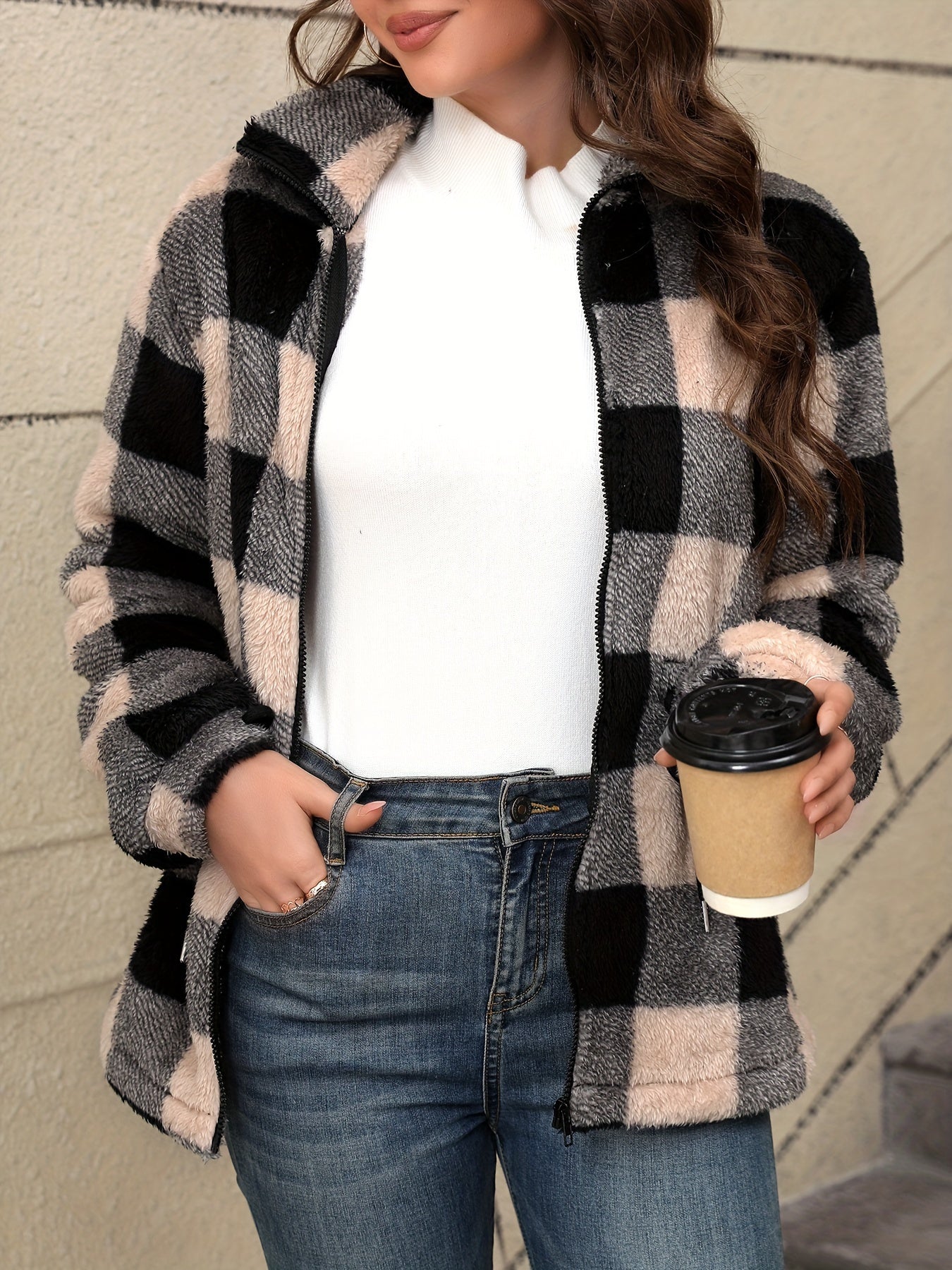 Agata | Damska kurtka polarowa w kratę z kapturem i kieszeniami